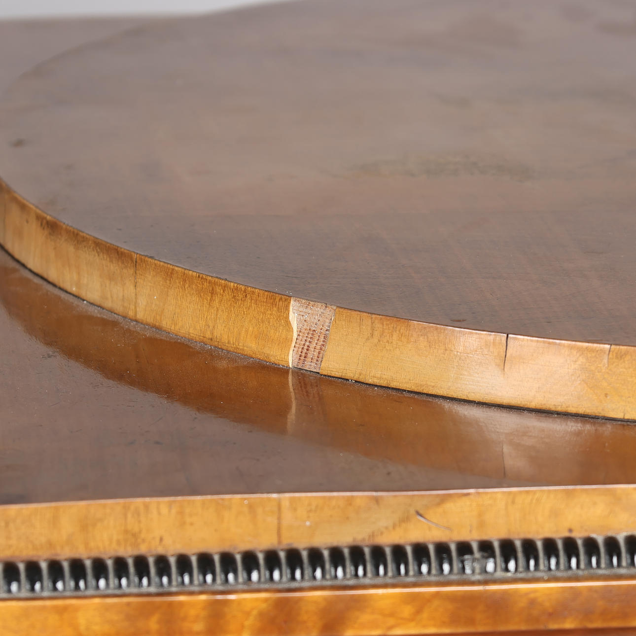 Aldersrelateret stand med brugsspor, finérafslag.