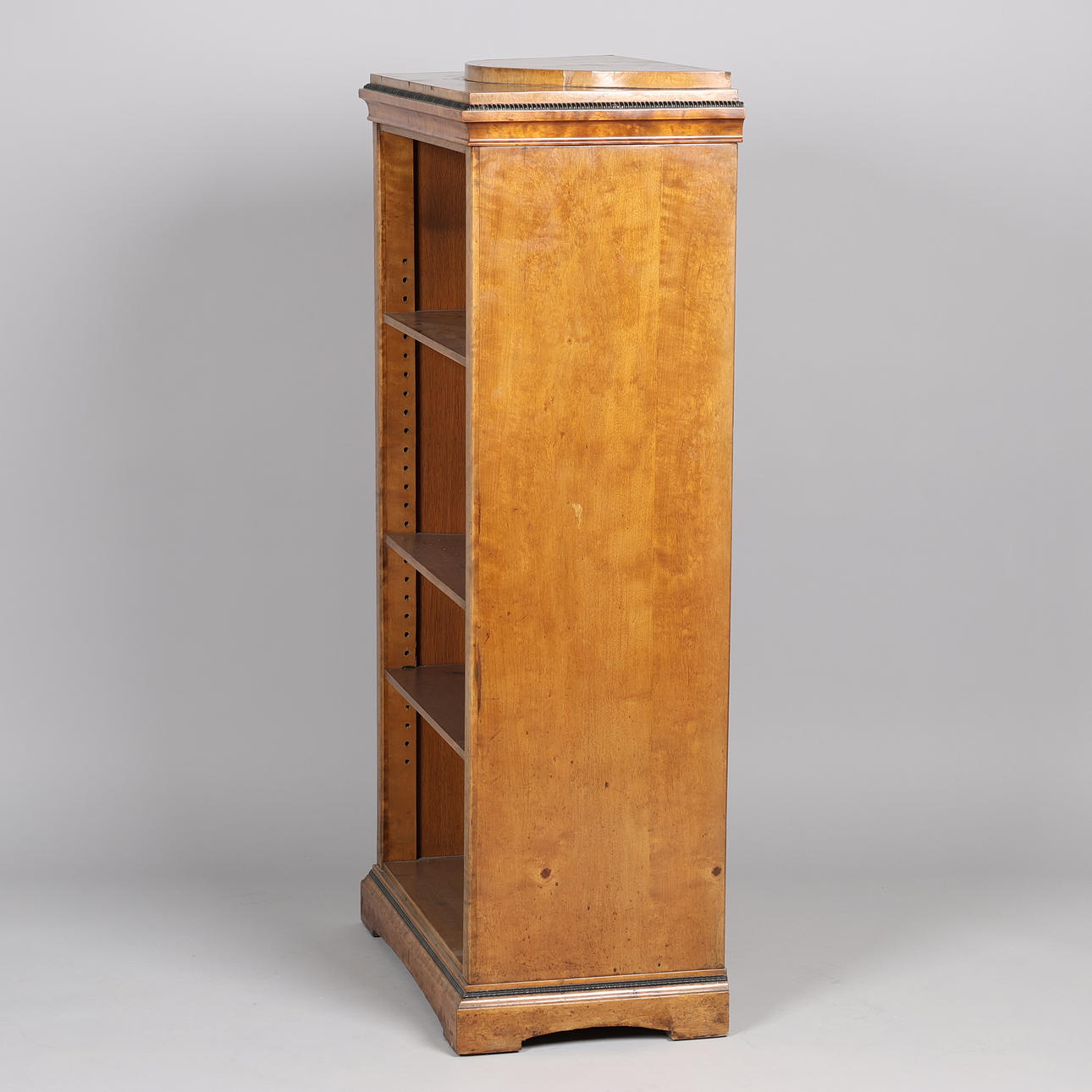 Birkefineret reol med tre flytbare hylder, buet topstykke, ca.1920. Højde 124 x 63 x 36 cm.