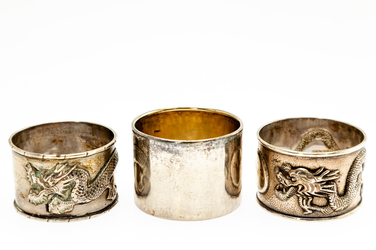 To servietringe med dragedekoration, Kanton/Hong Kong, stemplet på indersiden;