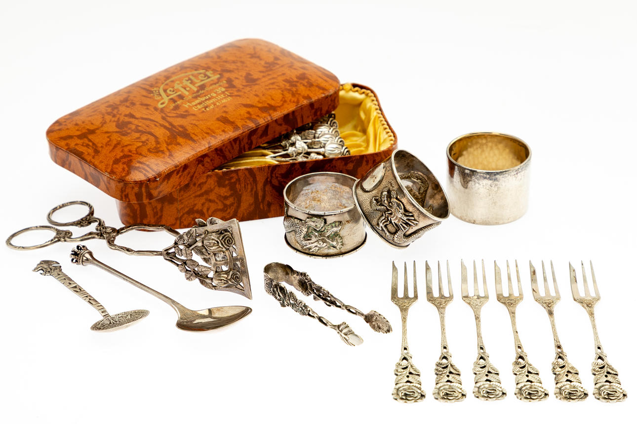 4333324. Samling af sølvtøj og tre servietringe, sølv (19).