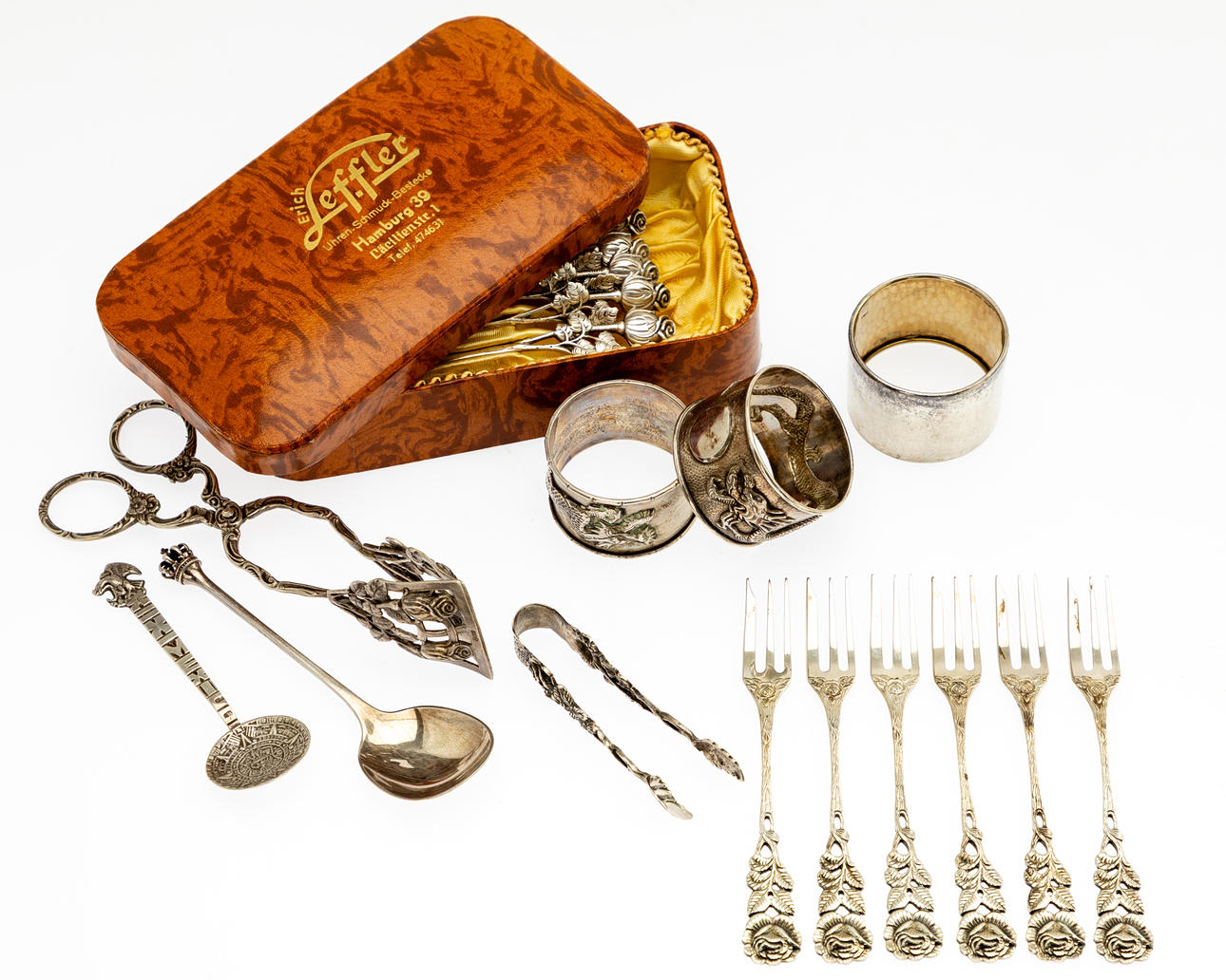 Samling af sølvtøj og tre servietringe, sølv (19).