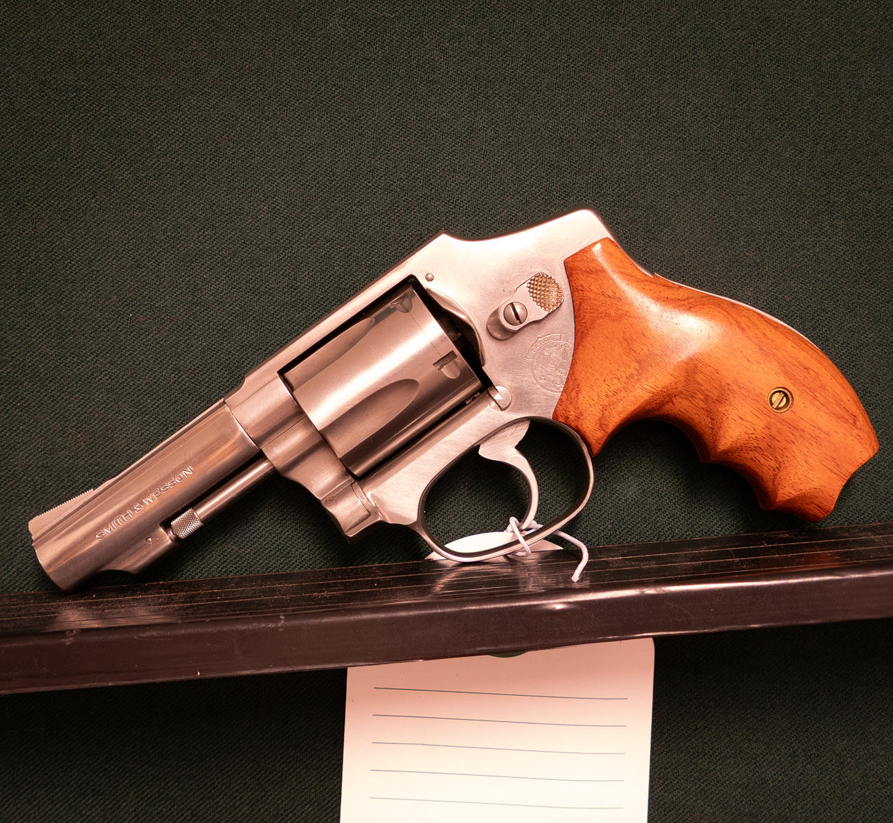 Revolver American Make Smith & Wesson Model 940. Kaliber 9x19. Supplerende nr. BKN0065. Tudlængde 7,5cm. Fast mål. Skjult hane. Våbenet helt i rustfrit stål. Grebformede stempelsider lavet af træ. Klip til opladning og original æske inkluderet.