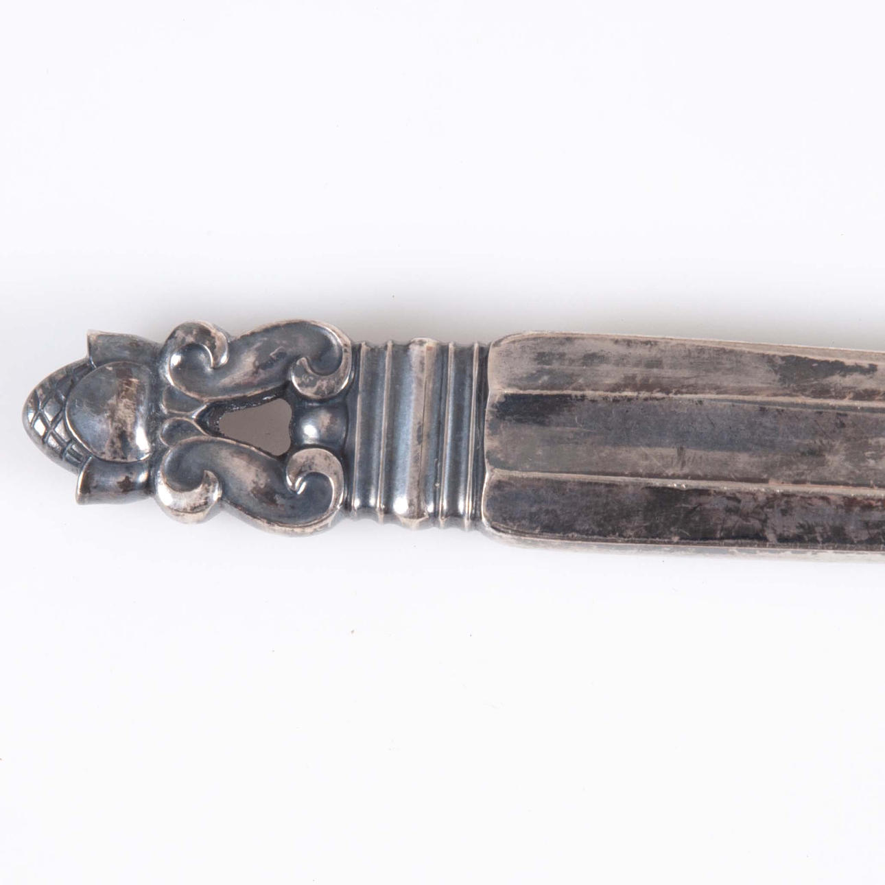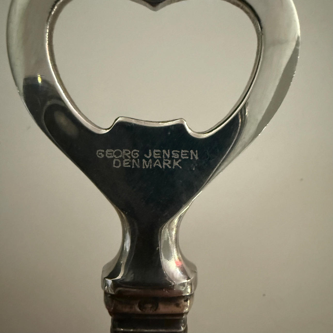 Georg Jensen, Danmark. Flaskeåbner med håndtag i sterlingsølv, indretning i klassisk „Acorn“ mønster, design af Johan Rohde. Stemplet Georg Jensen Danmark og Sterling.