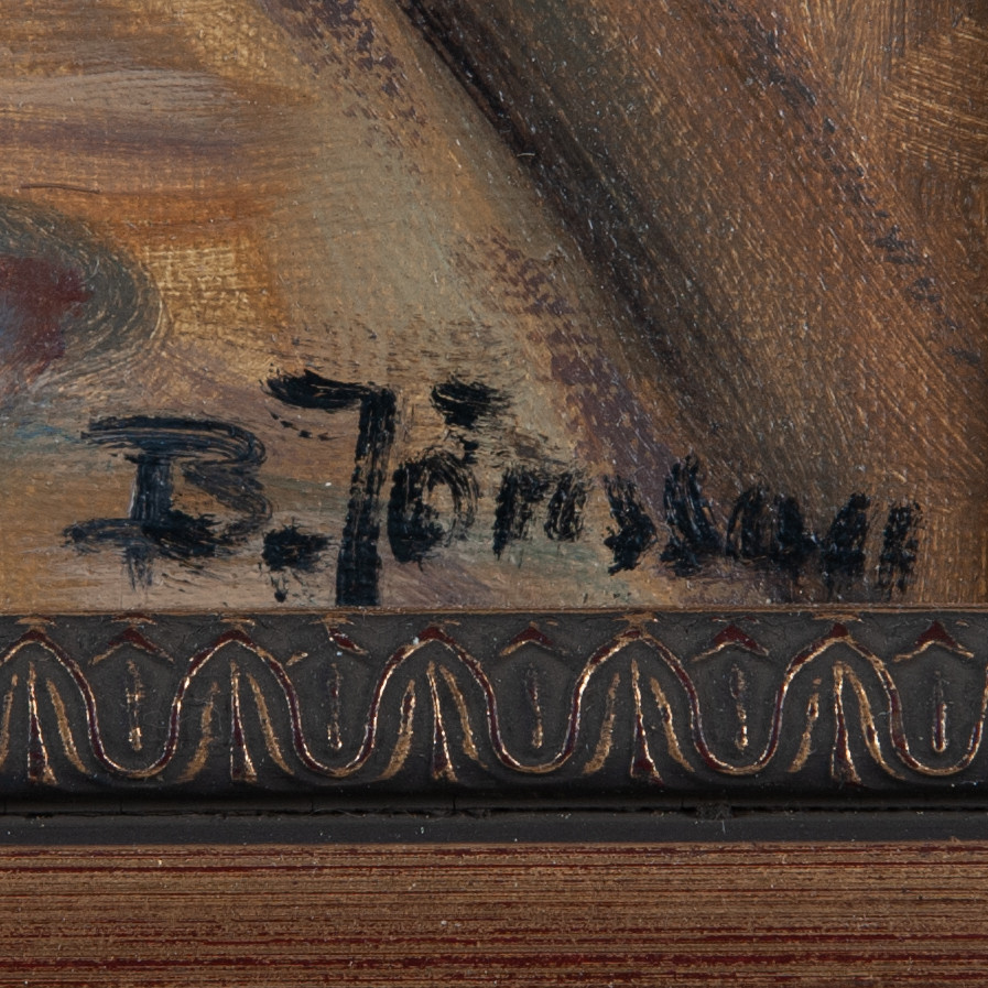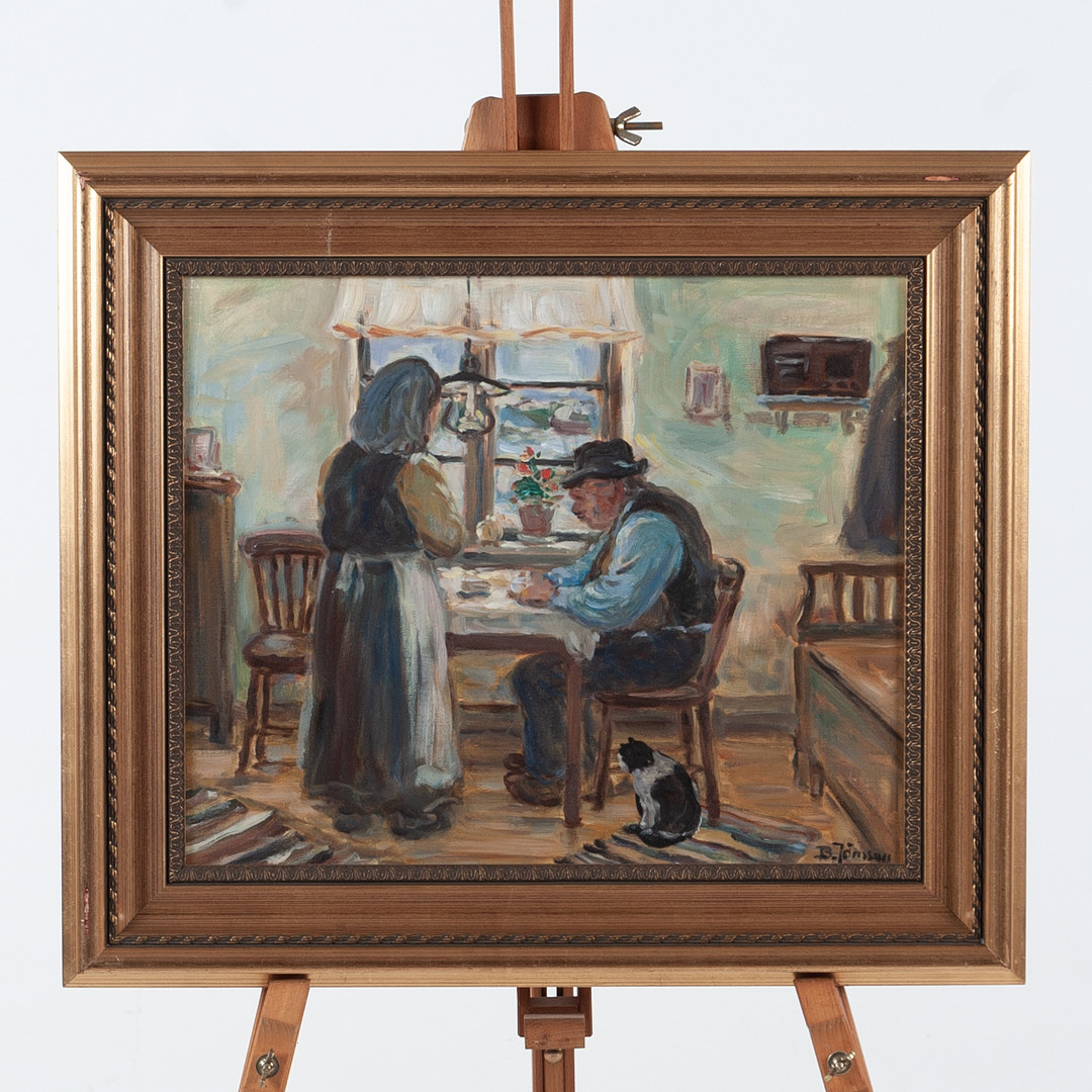 4334629. OIDENTIFIERAD KONSTNÄR. Olie på lærred, indvendigt billede „Ved bordet“.
