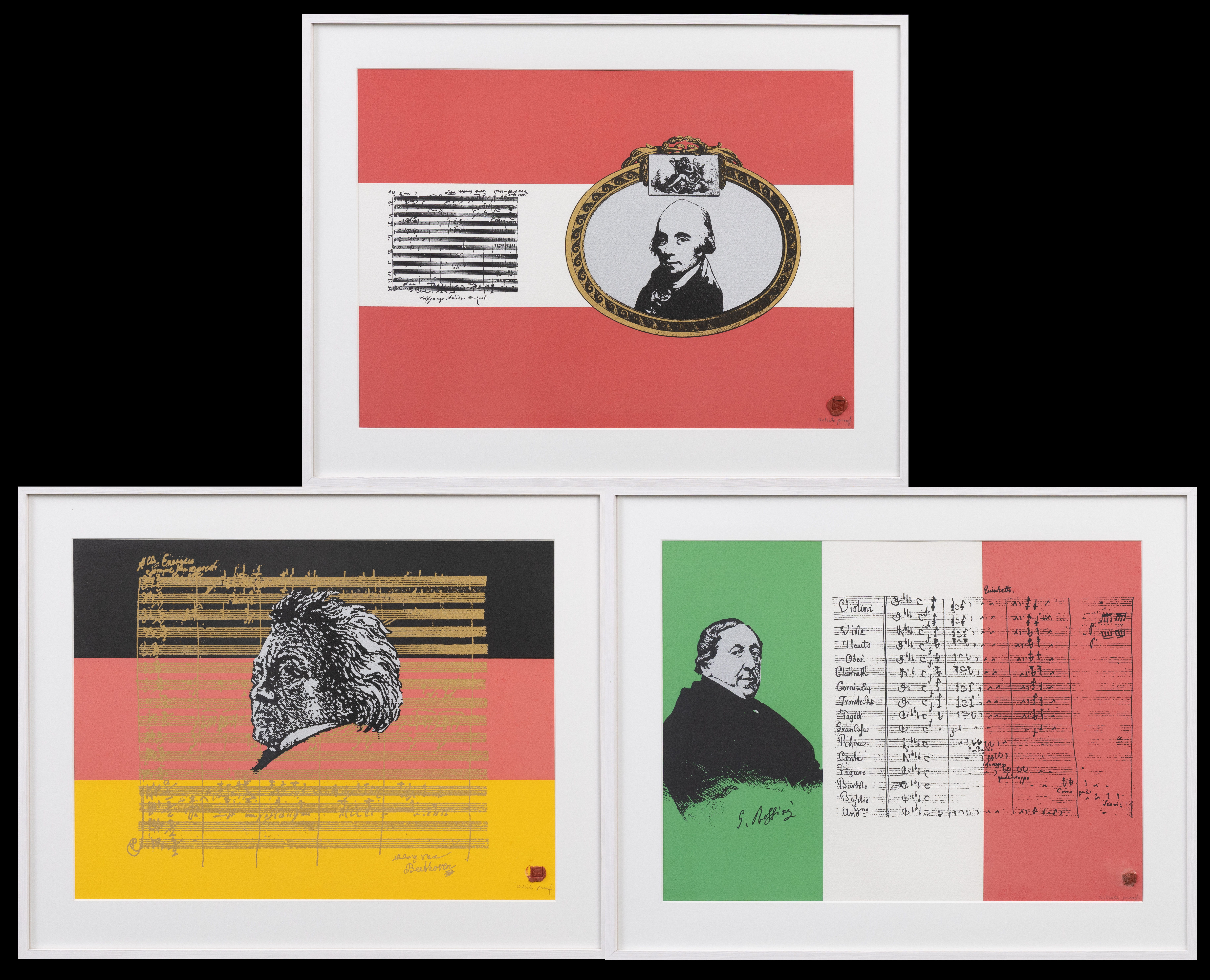 4334751. ALF STRIDFELDT. Tre silketryk, komponister, AP-tryk, segl stempel.
