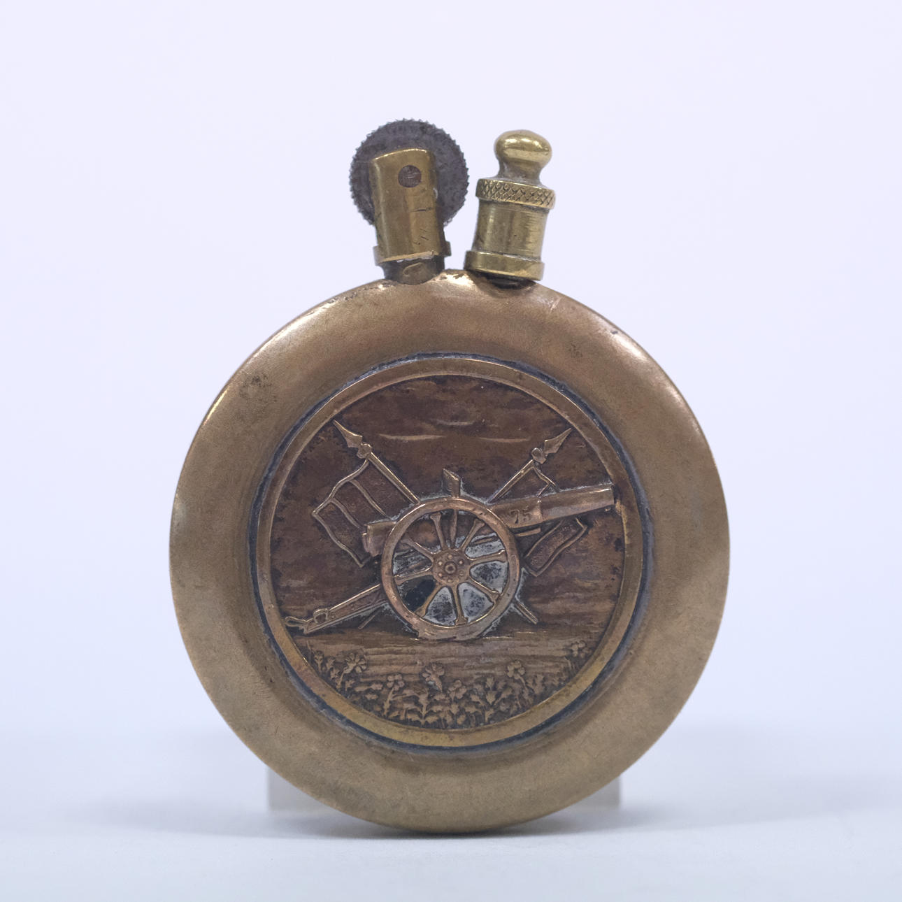 LIGHTER, messing, LA DEFENSE DE VERDUN 1916 PÅ NE PASSE PAS. Højde 6cm, diameter 4,8cm.