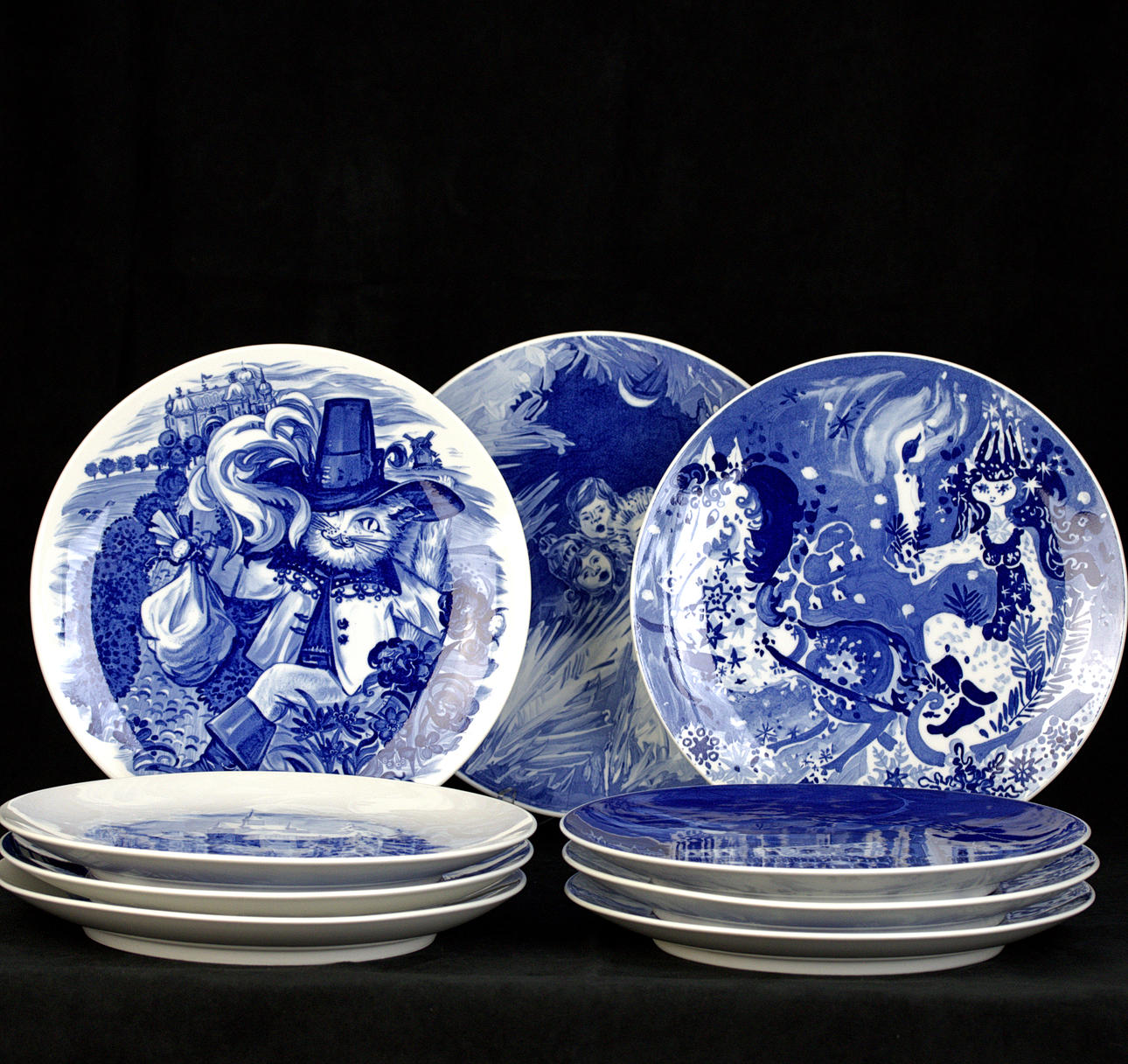9 stykker, højde 3 cm, diameter 26 cm. Forskellige motiver. 1972—1980.