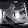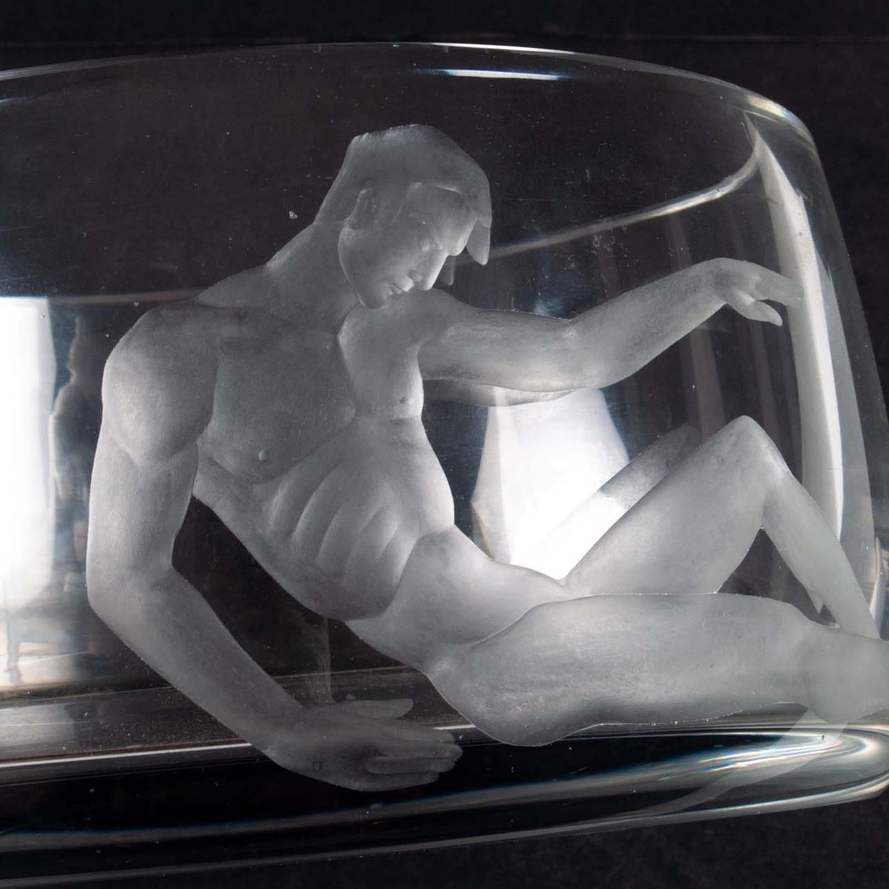Klar glasskål med dybt indgraveret nøgen mandlig figur i klassisk stil. Signeret Elme A.W. V. Andersson nedenfor.