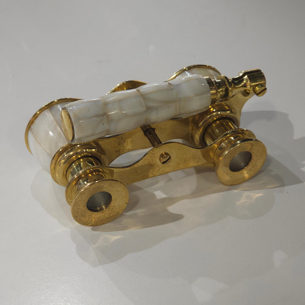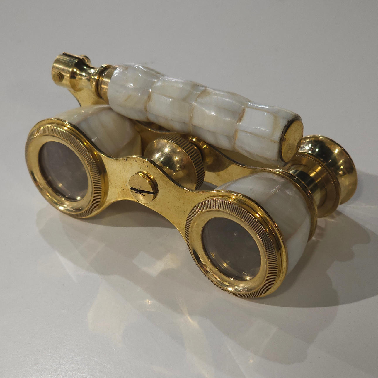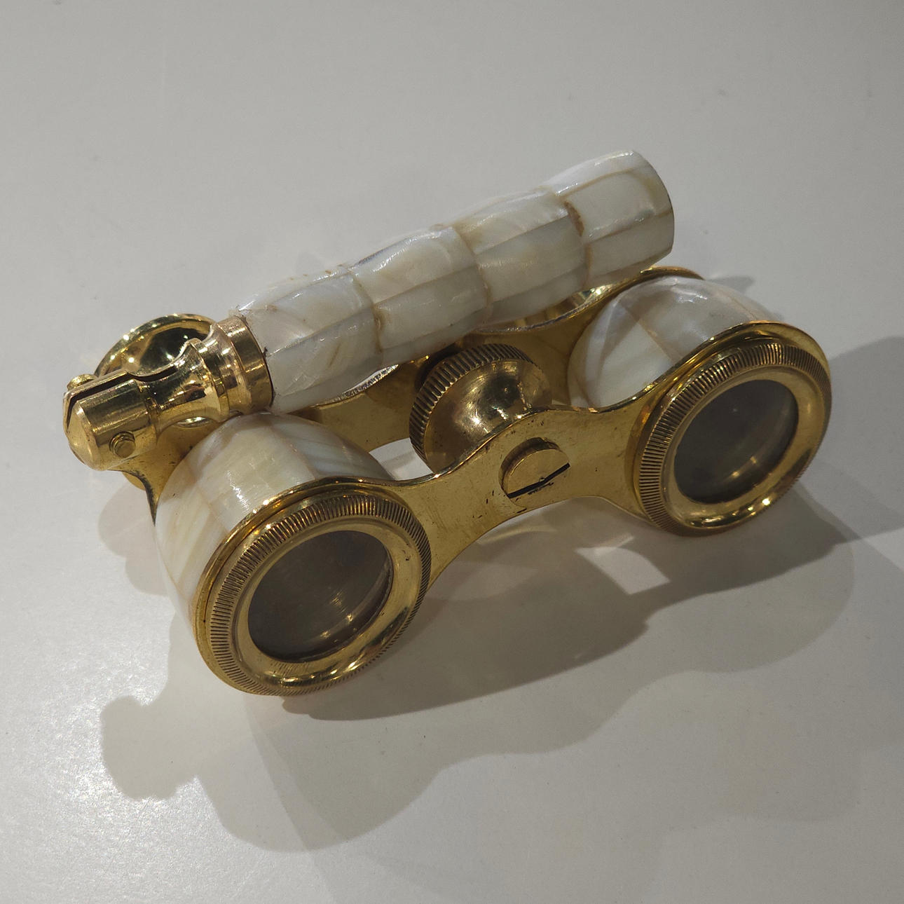 Kikkert til teater i metal og perlemor.