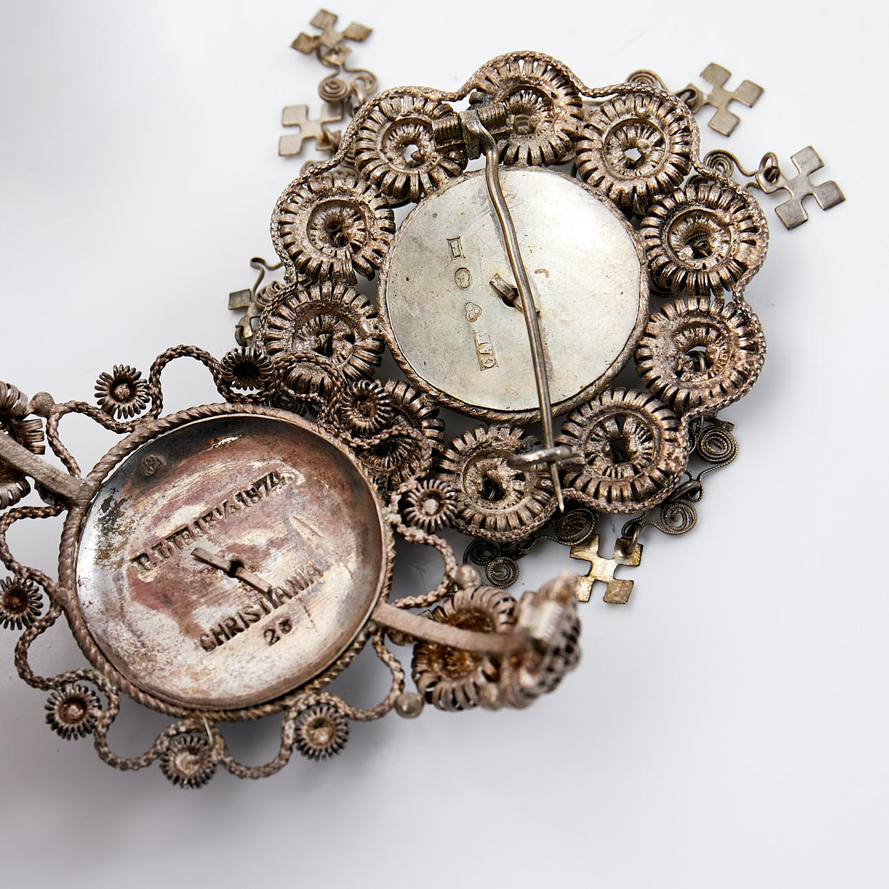 4339300. BROCHE OG ARMBÅND, SØLV, 19. århundrede, filigran.