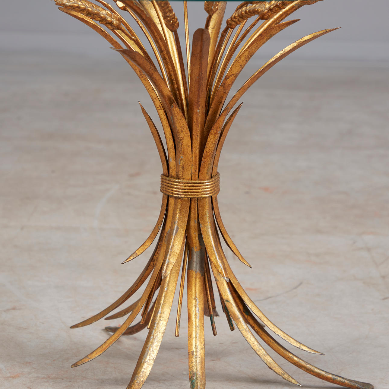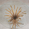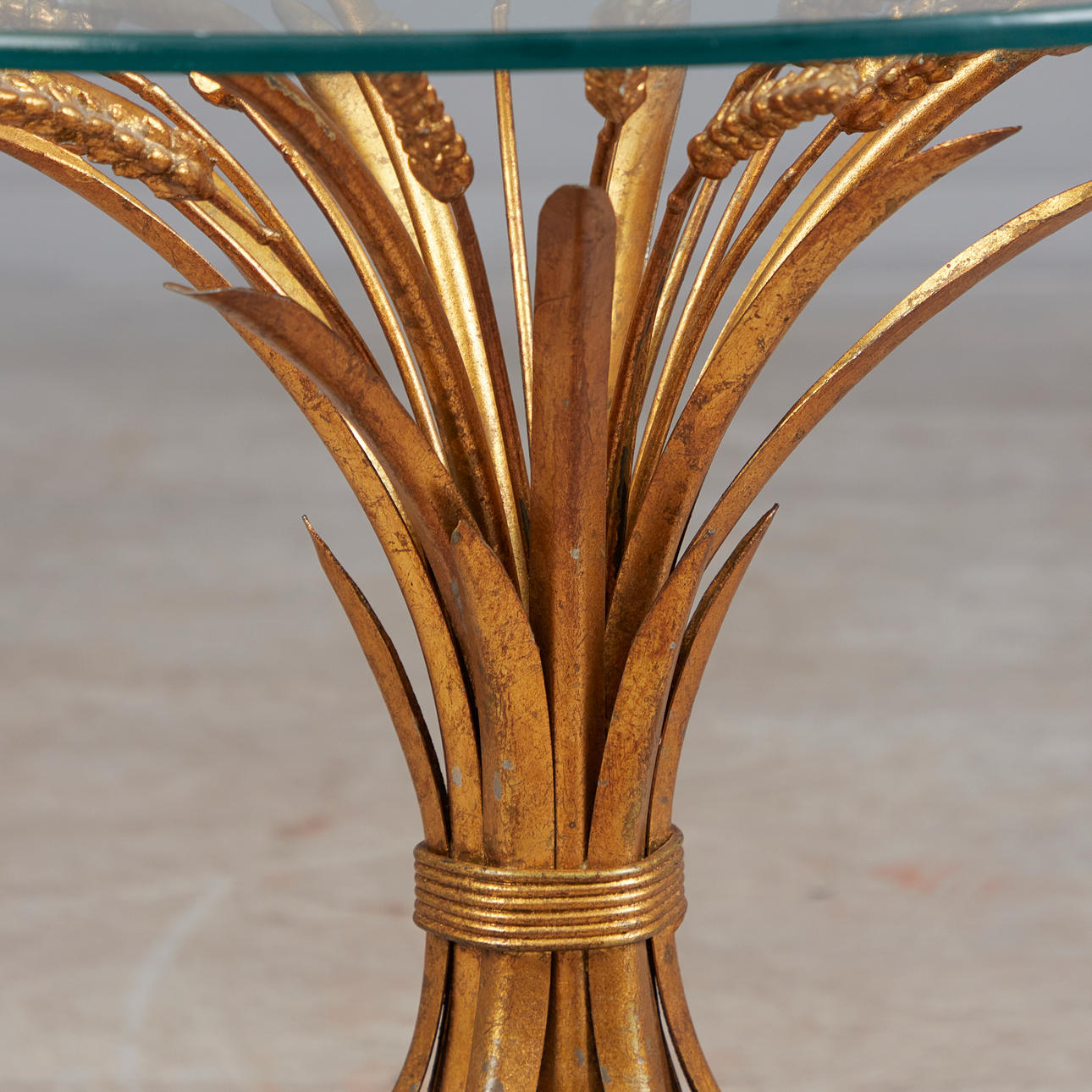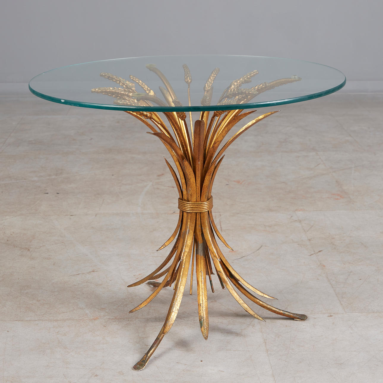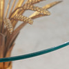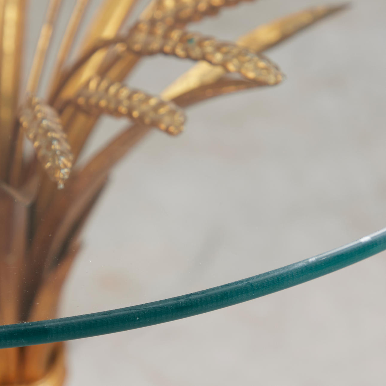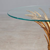 Sidebord med en trebenet base i form af et bundt hvede lavet af messingrør og messingplade, med en løs, rund bordplade lavet af klart glas, h.46cm, d.55cm.