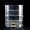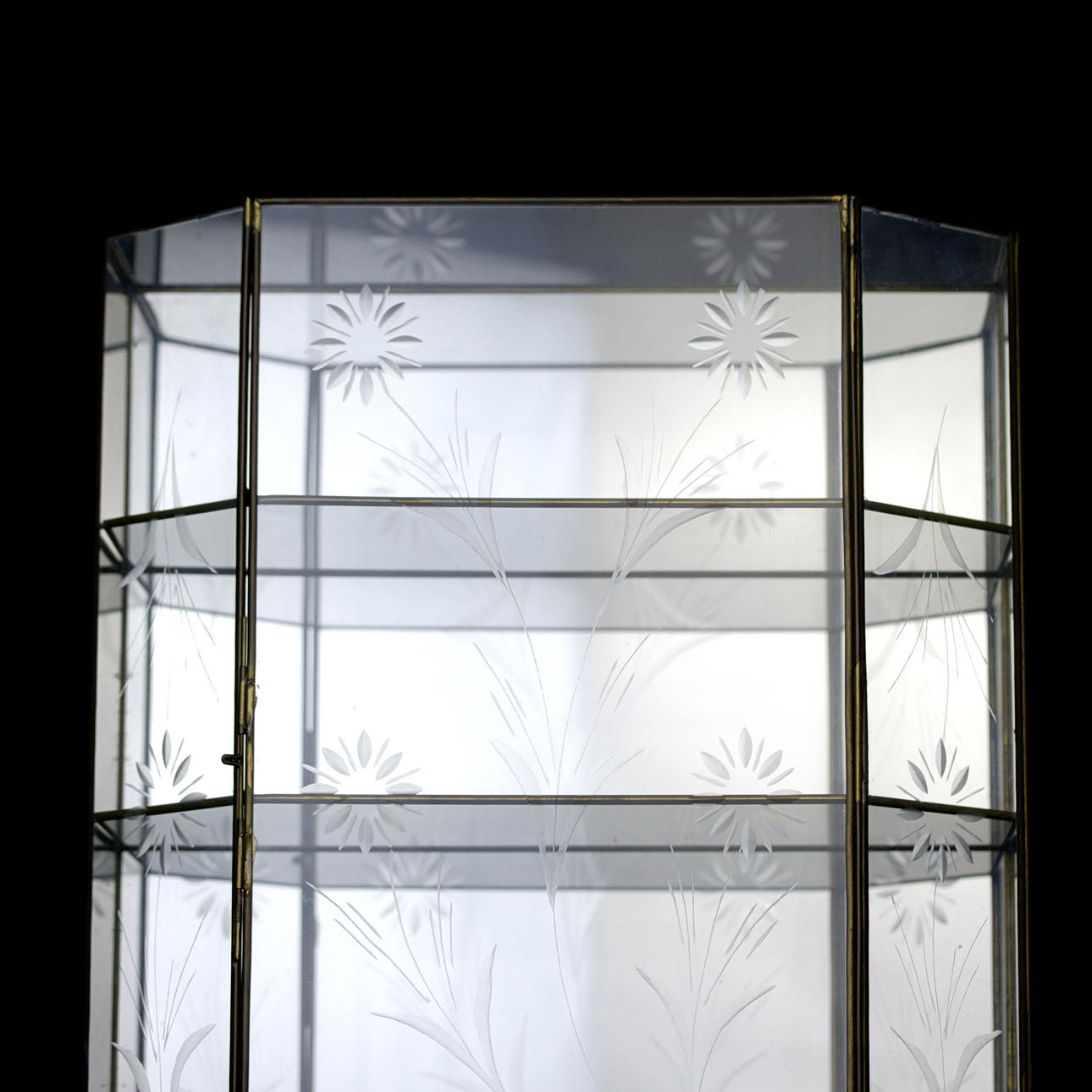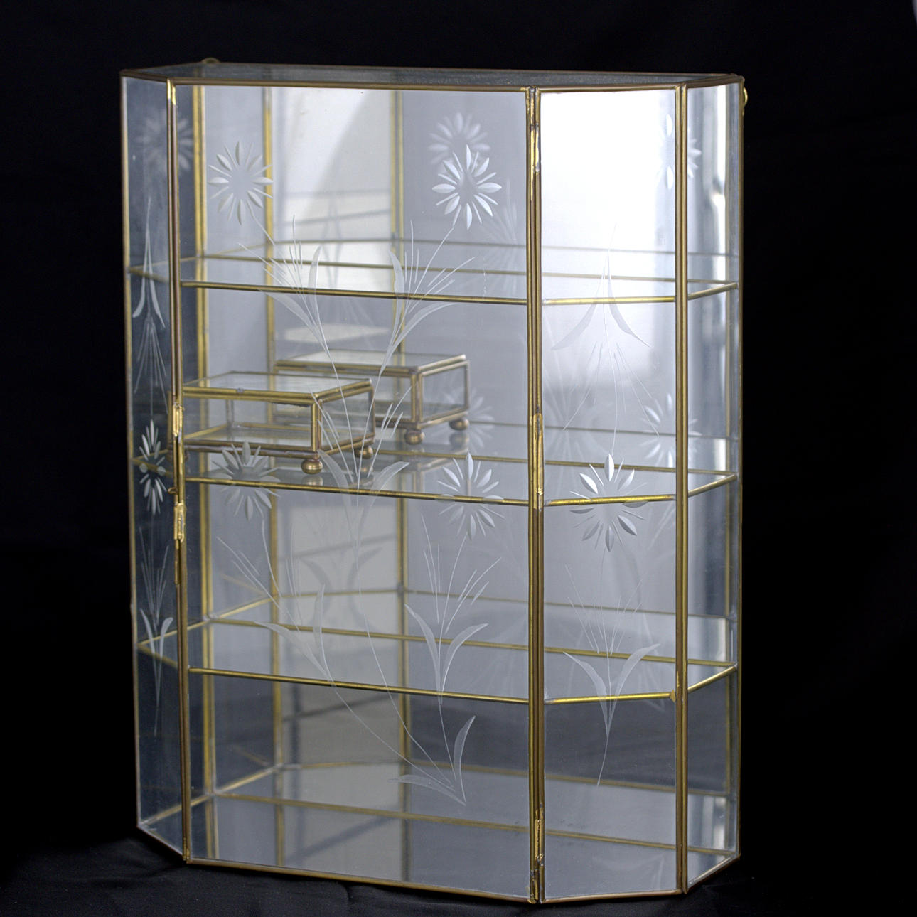 VITRINESKAB, glas og messing, ætset indretning, kan hænges op.