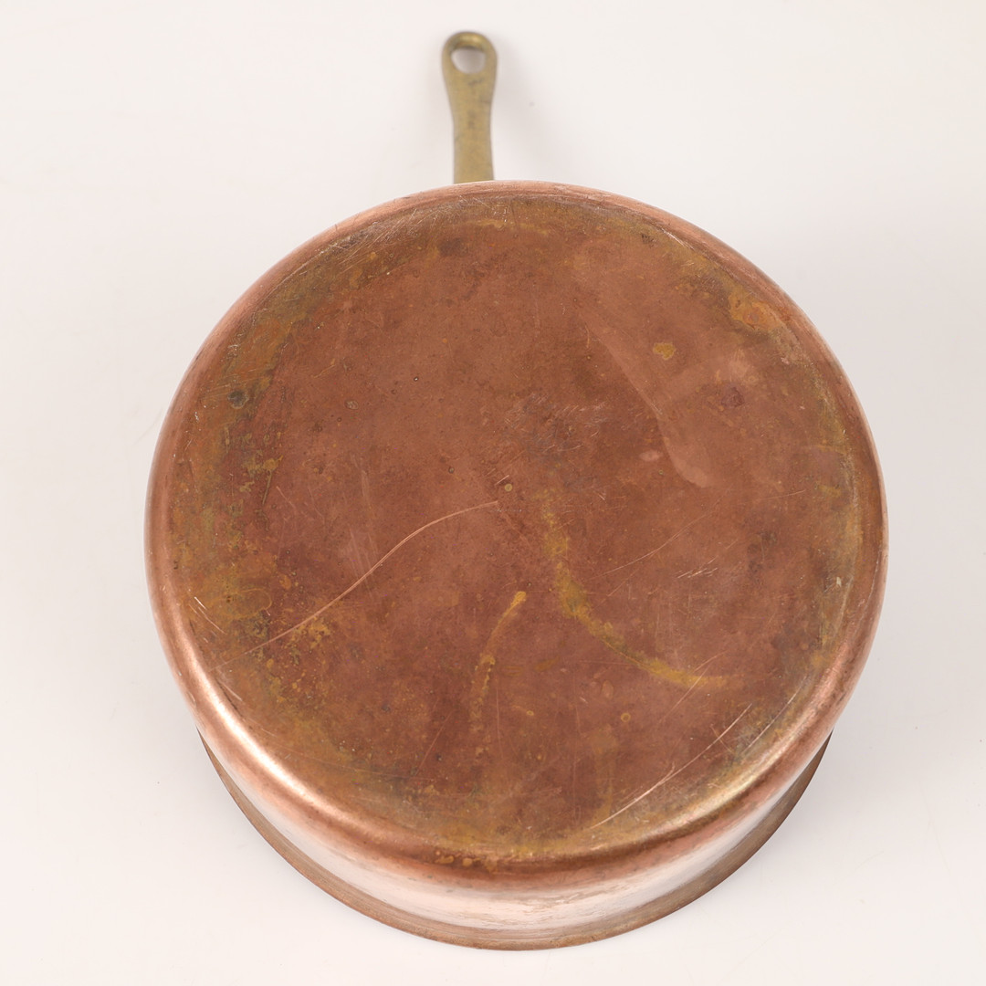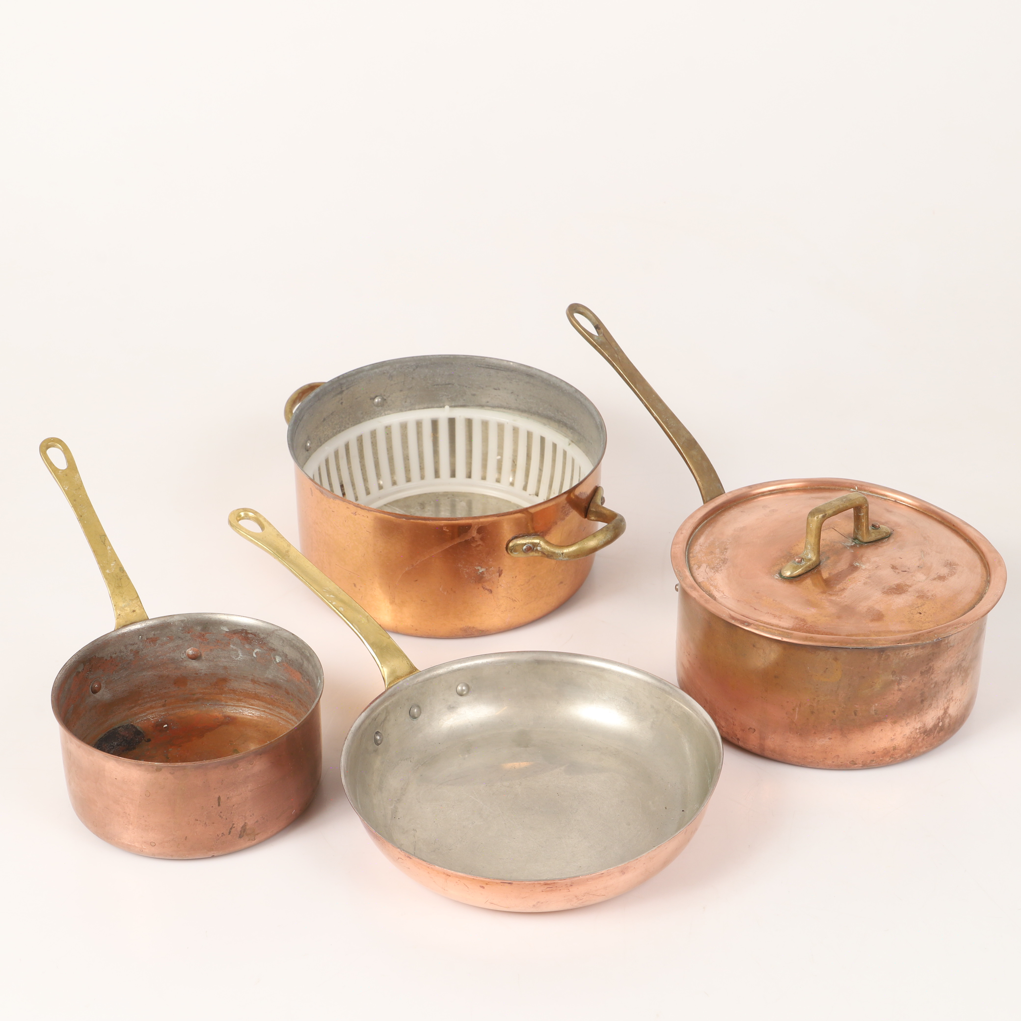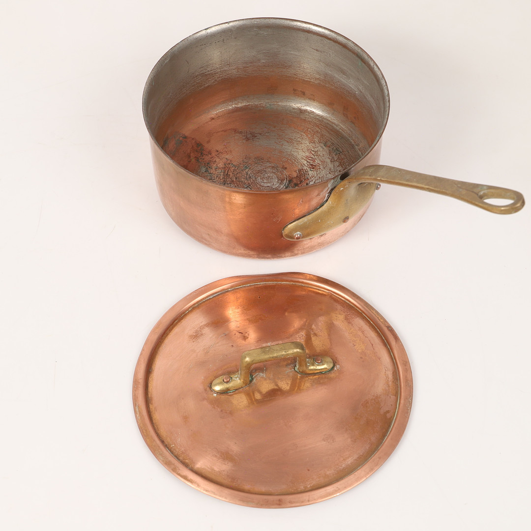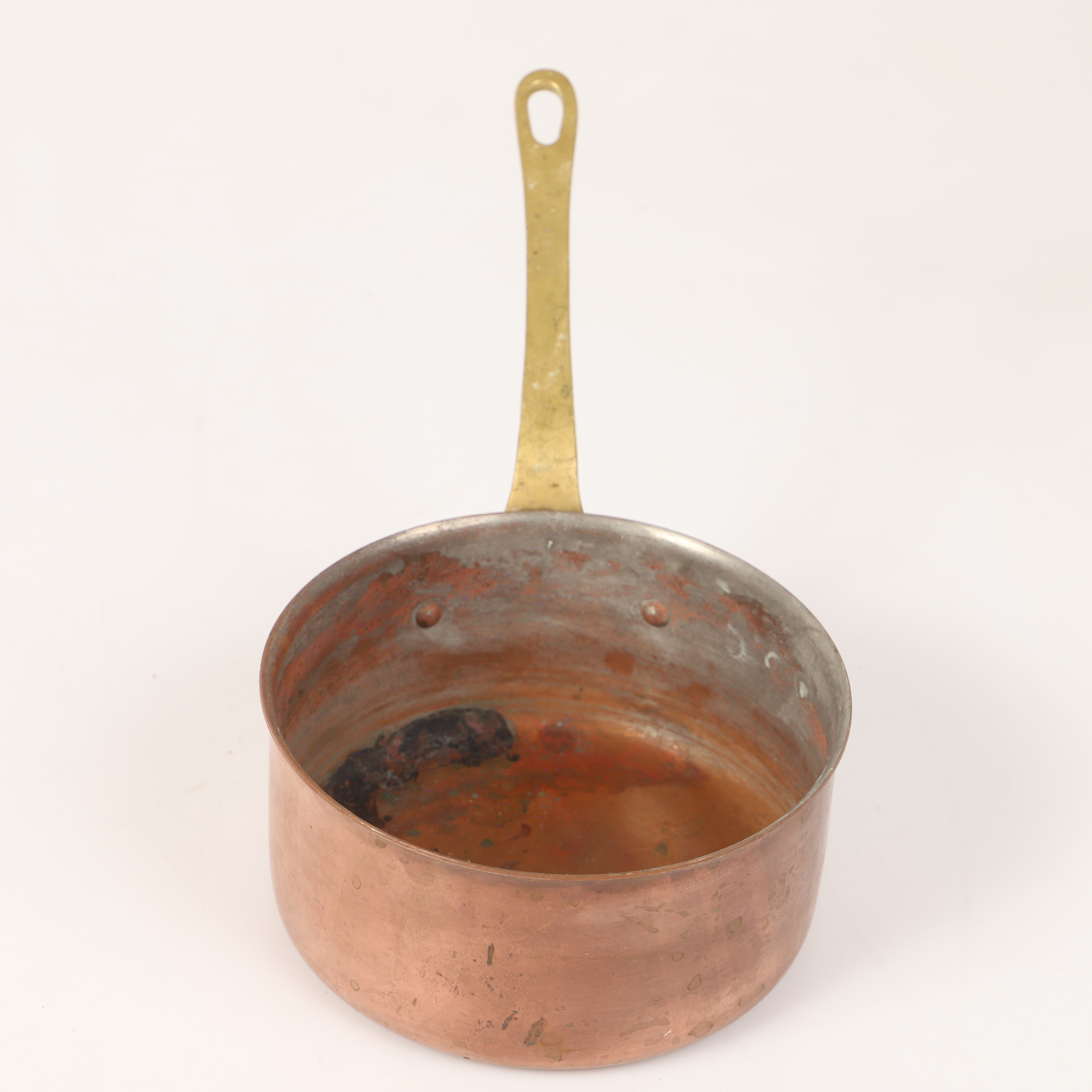 4339614. KASTRULLER ETC., 4 stk., kobber/messing, 20. århundrede.