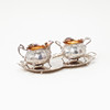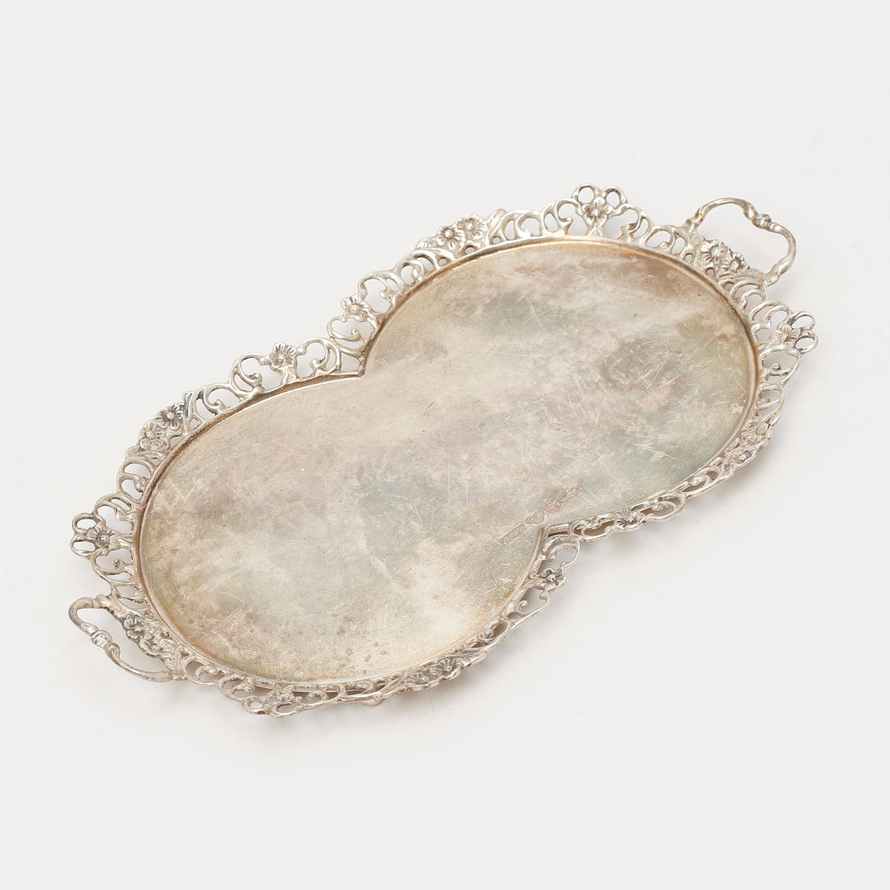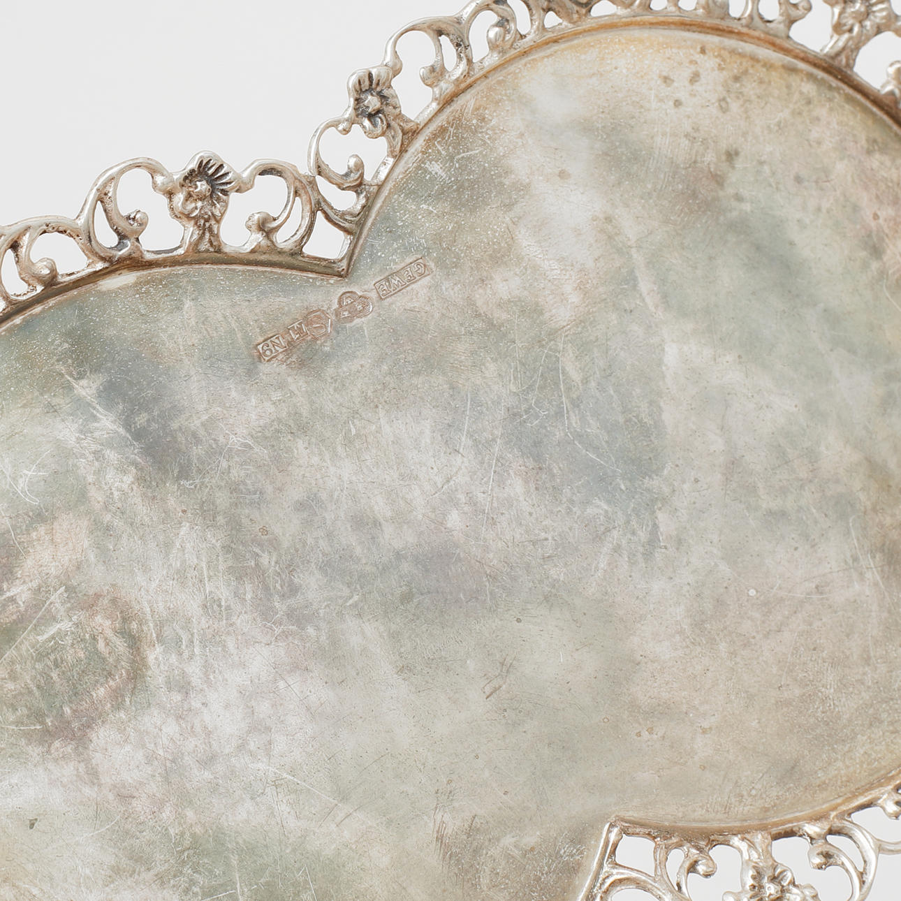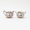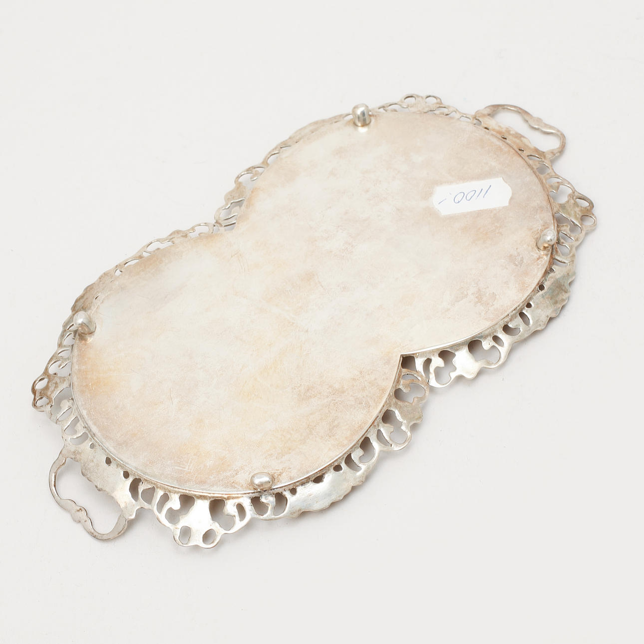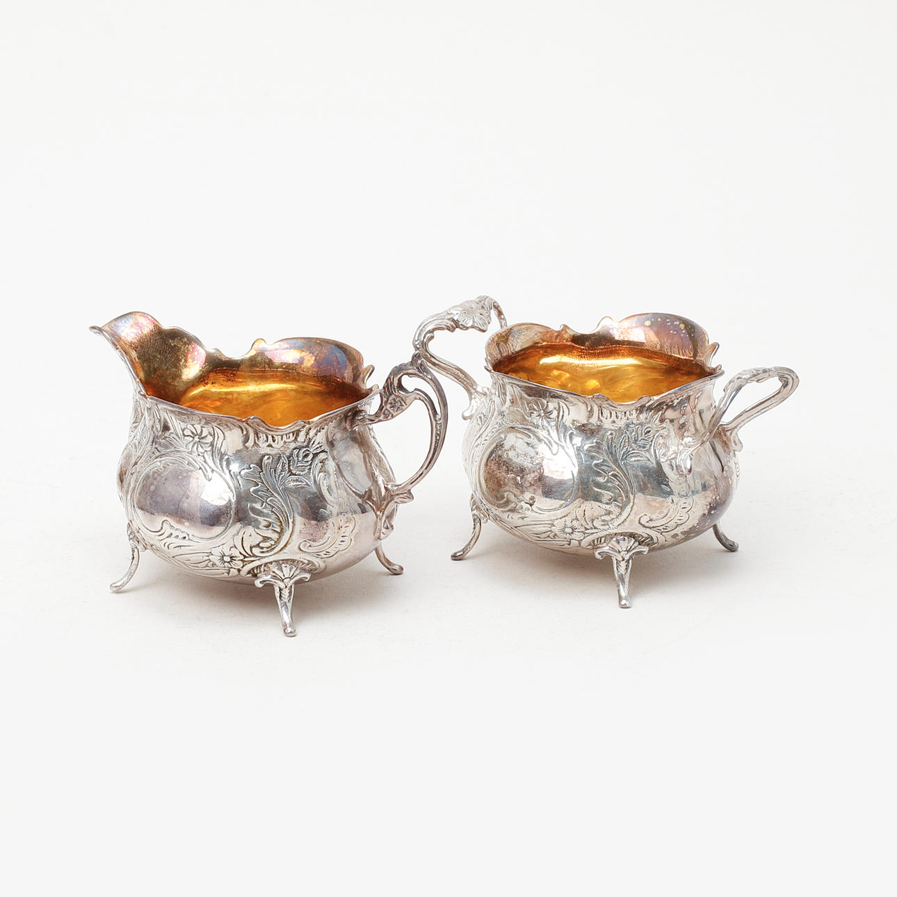 Flødekande, sukkerskål og bakke. Højde ca. 5,5 - 6,5 cm, bakkelængde ca. 21 cm. Samlet vægt ca. 342 gram.