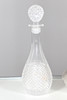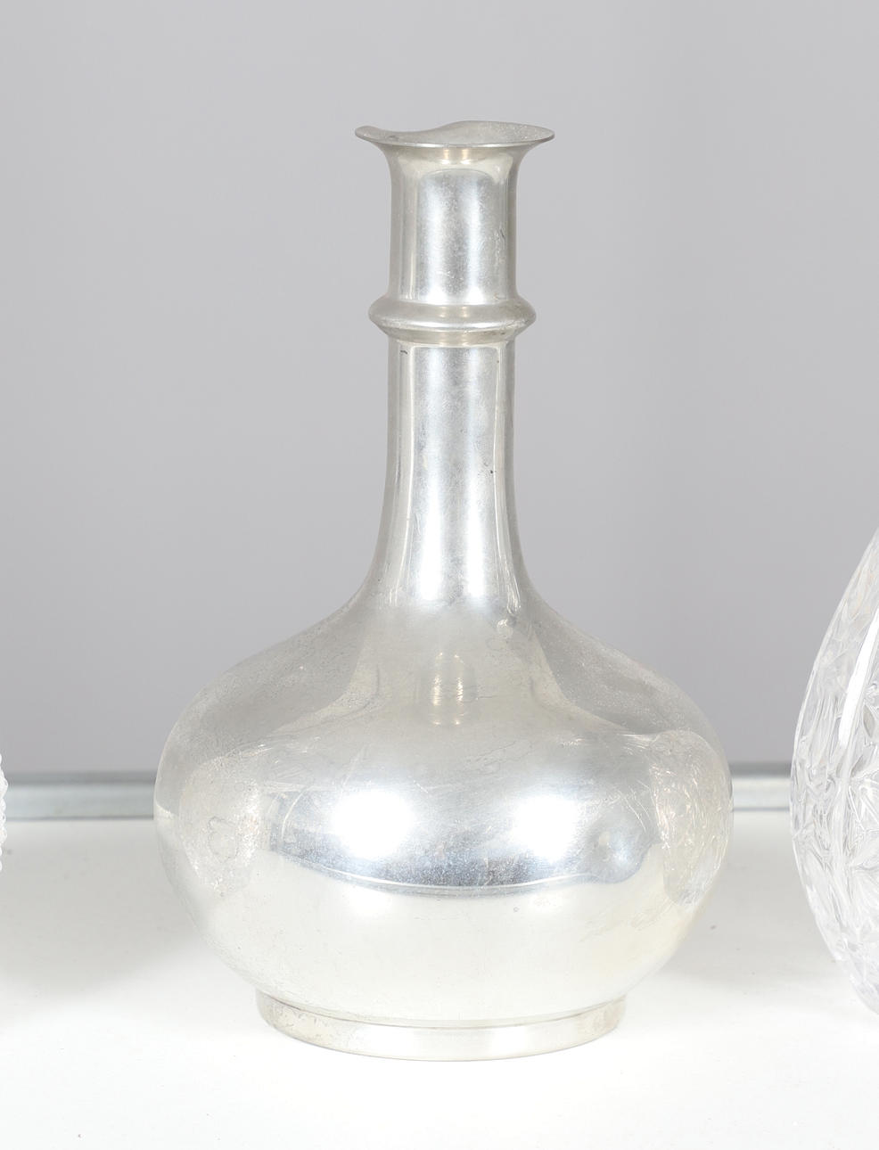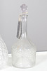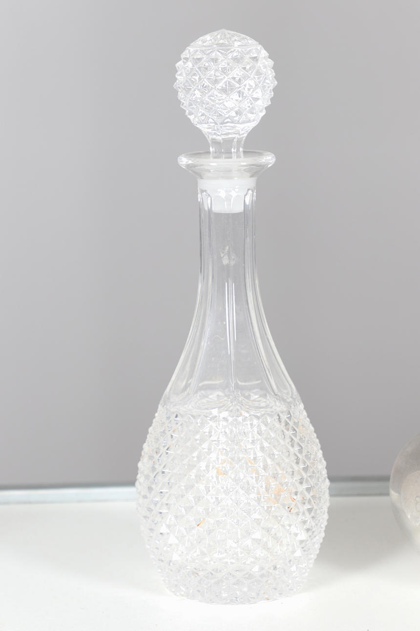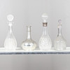De udskårne glaskaraffer i attraktivt design, en med sølvbelagt top (Højde 34,5 cm) og alle komplet med propper. Sammen med en kromkaraffel, med „Harrods“ -mærke i bunden, mangler prop (4).