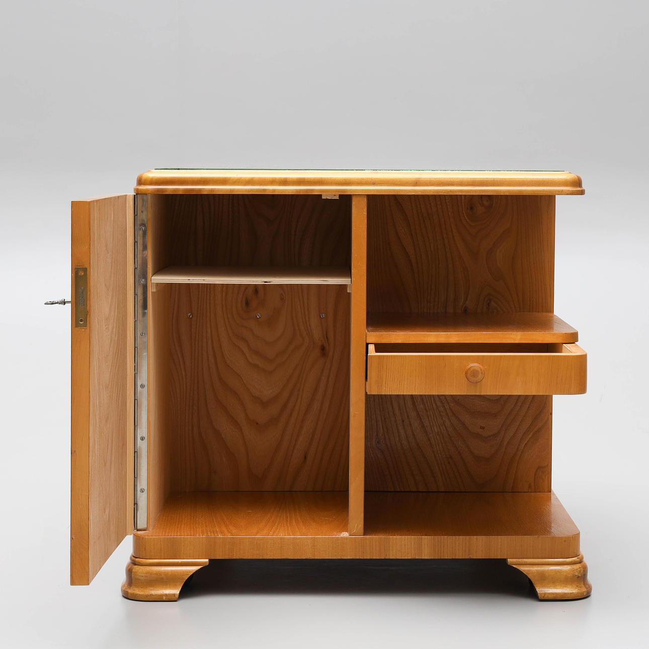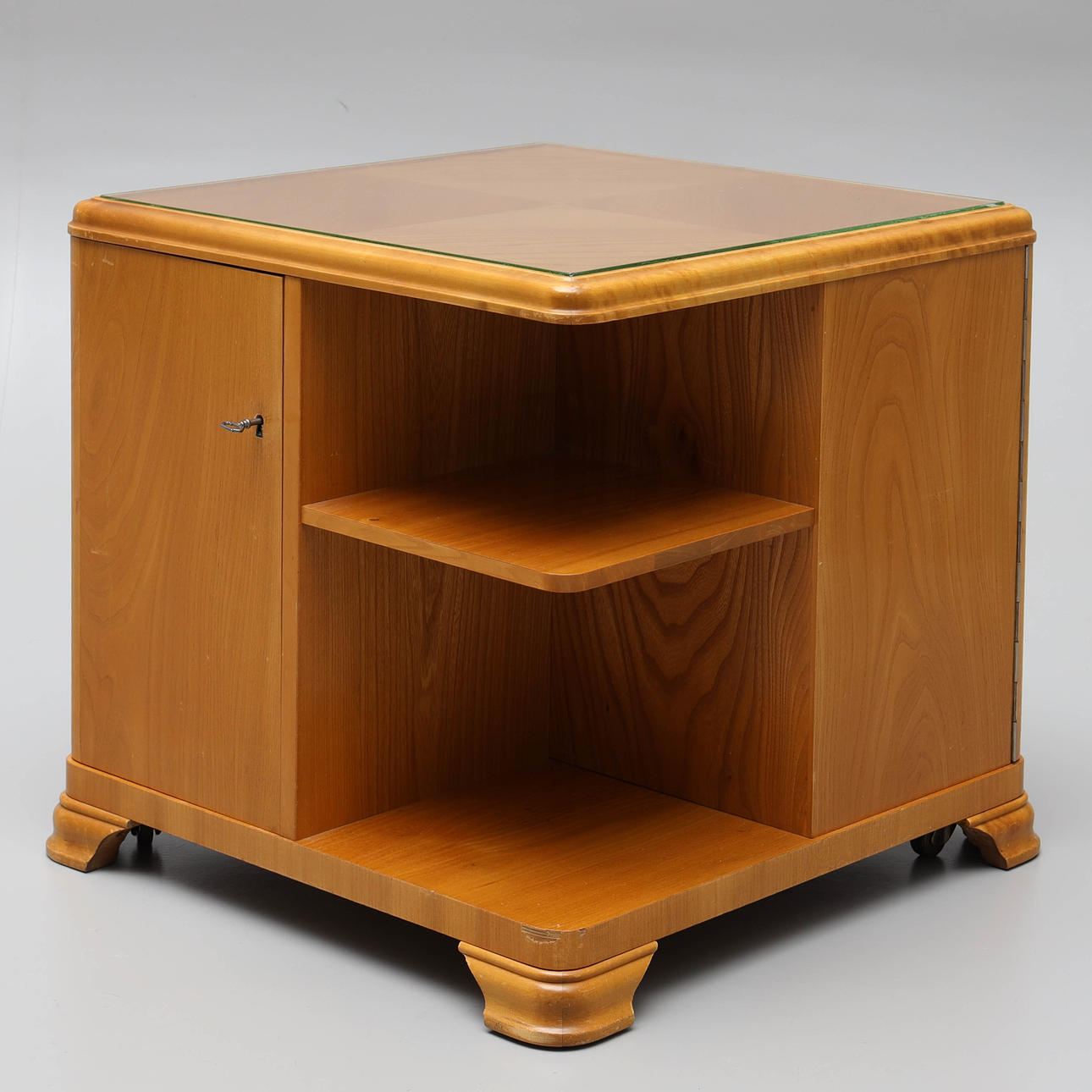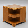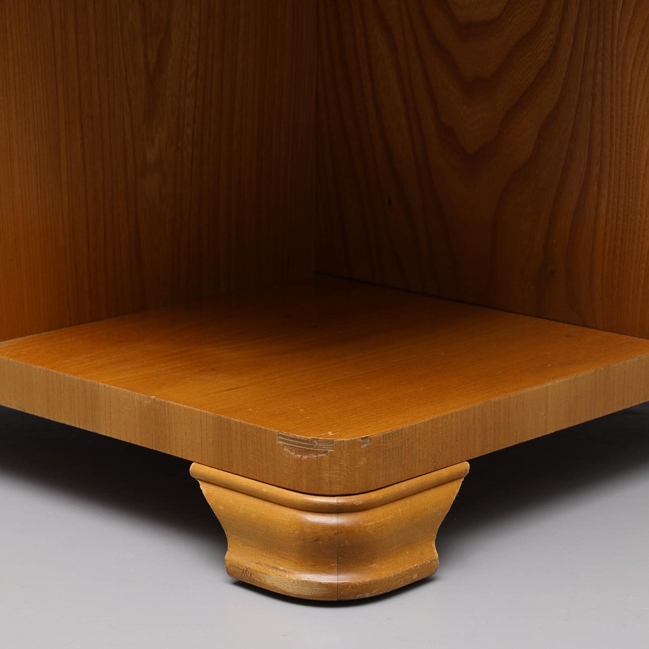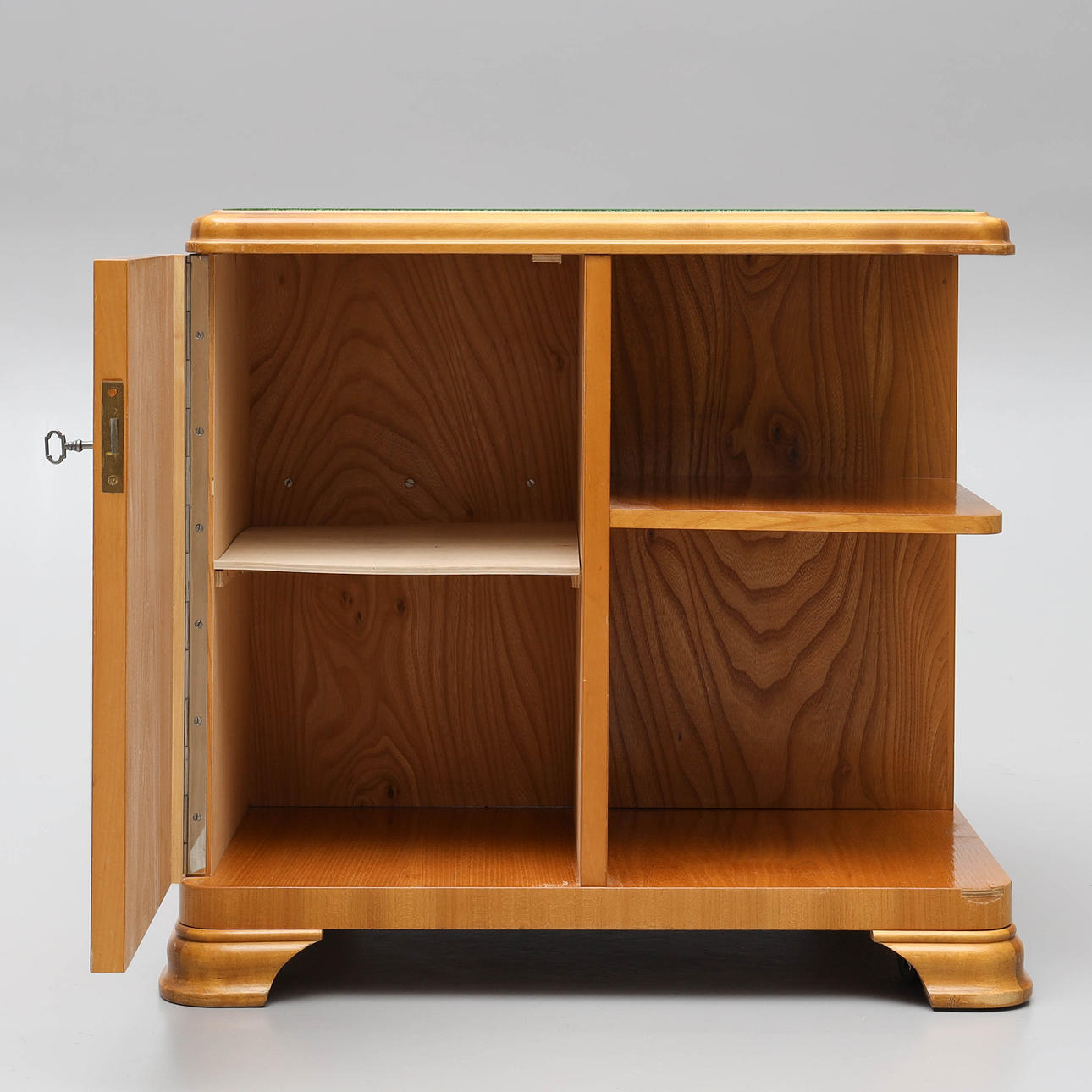 Rygebord med hylder og skabe.