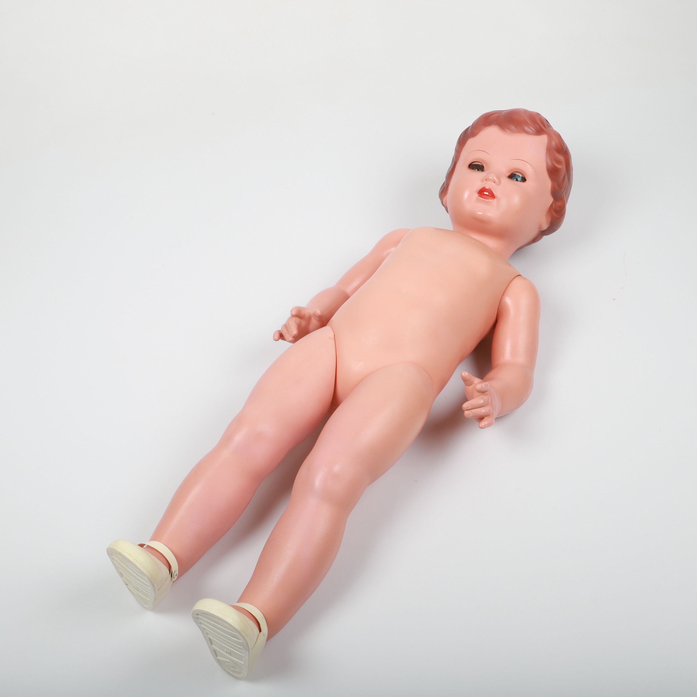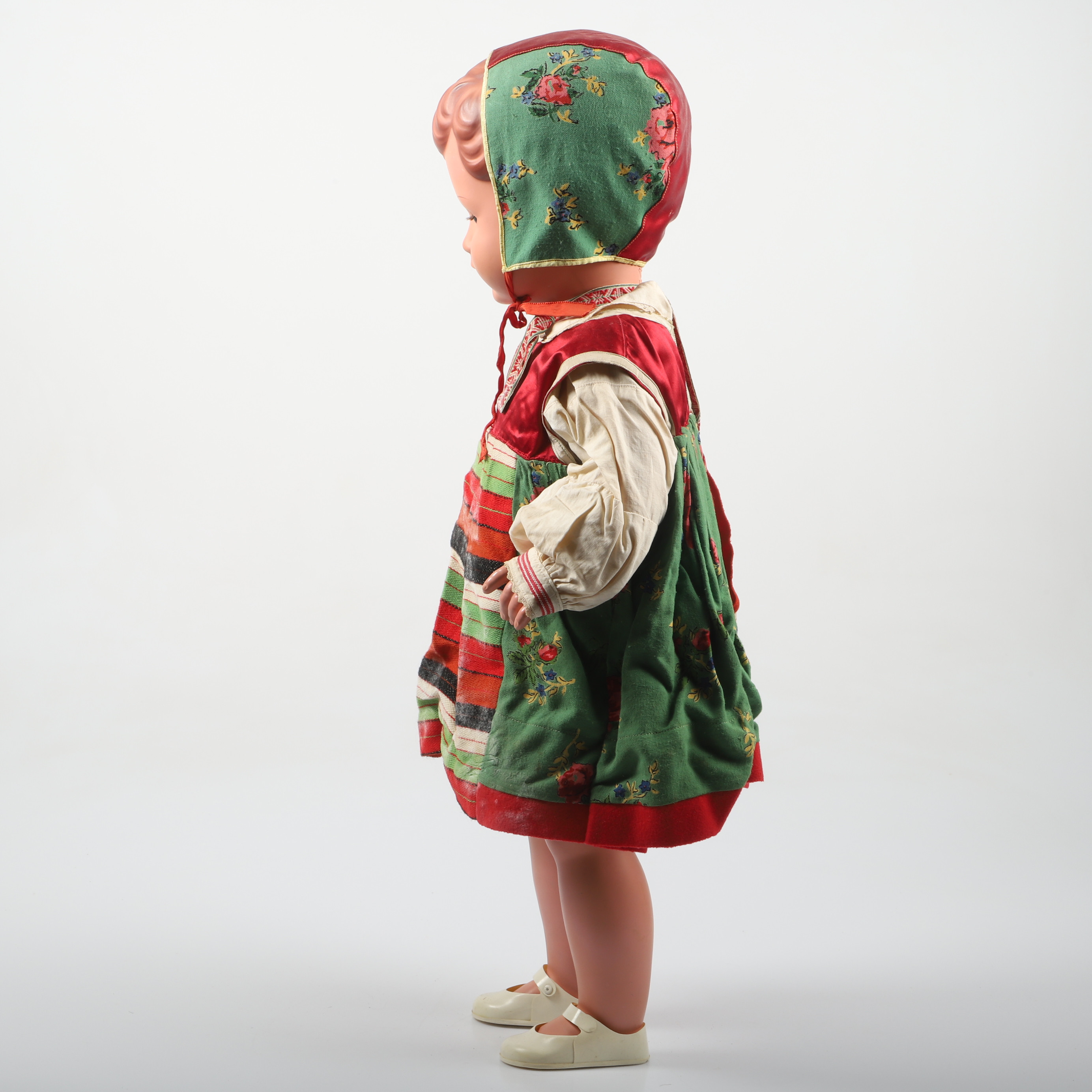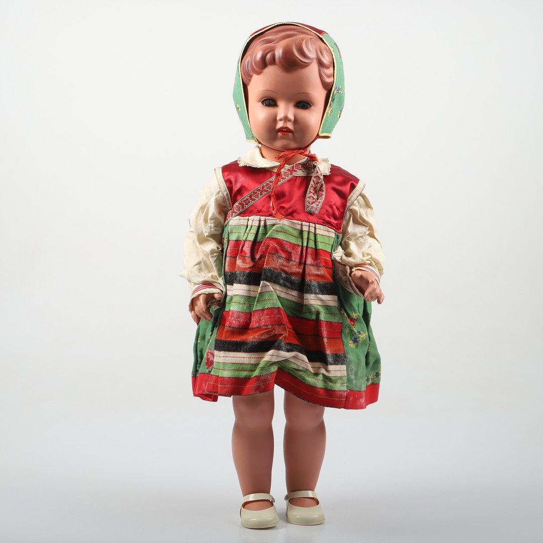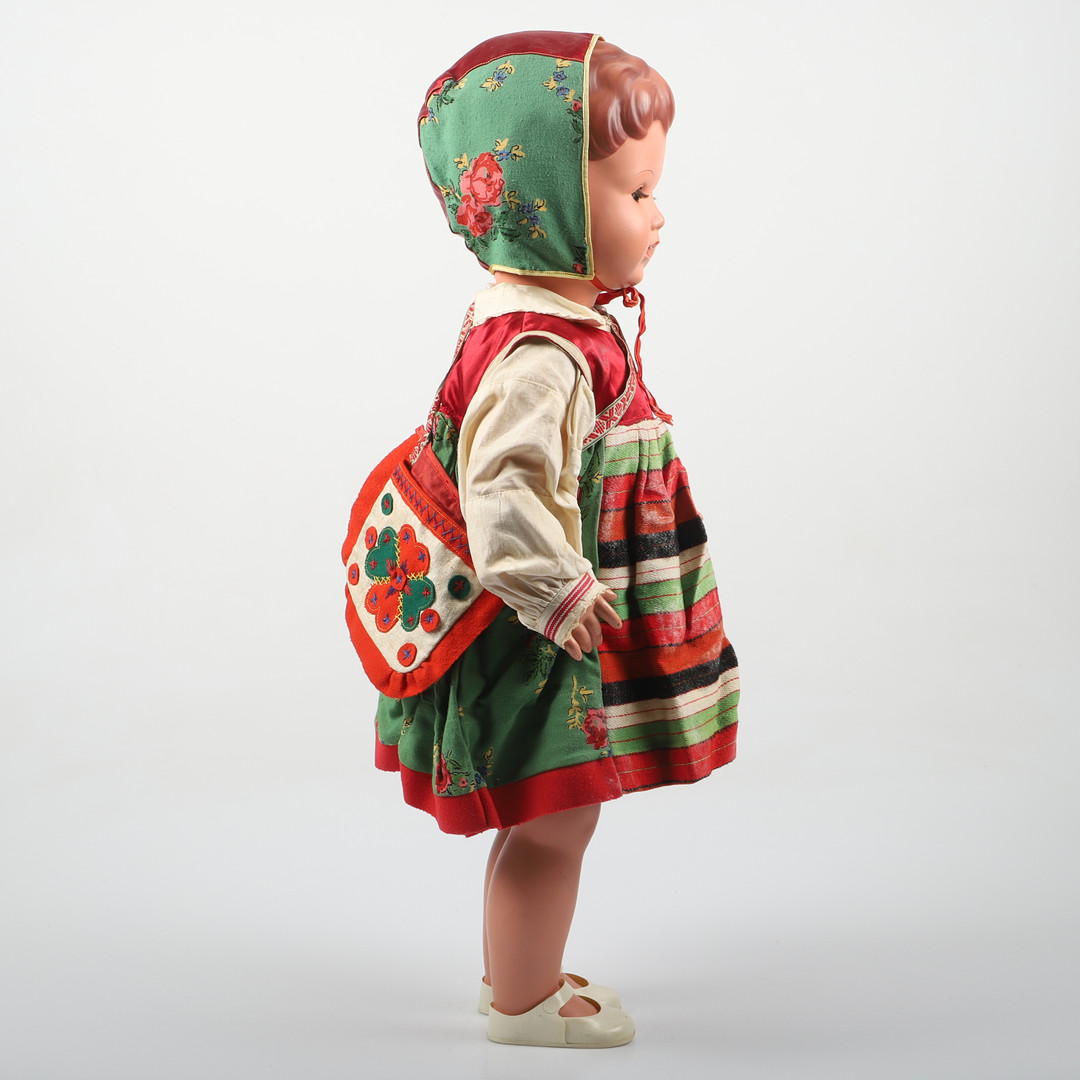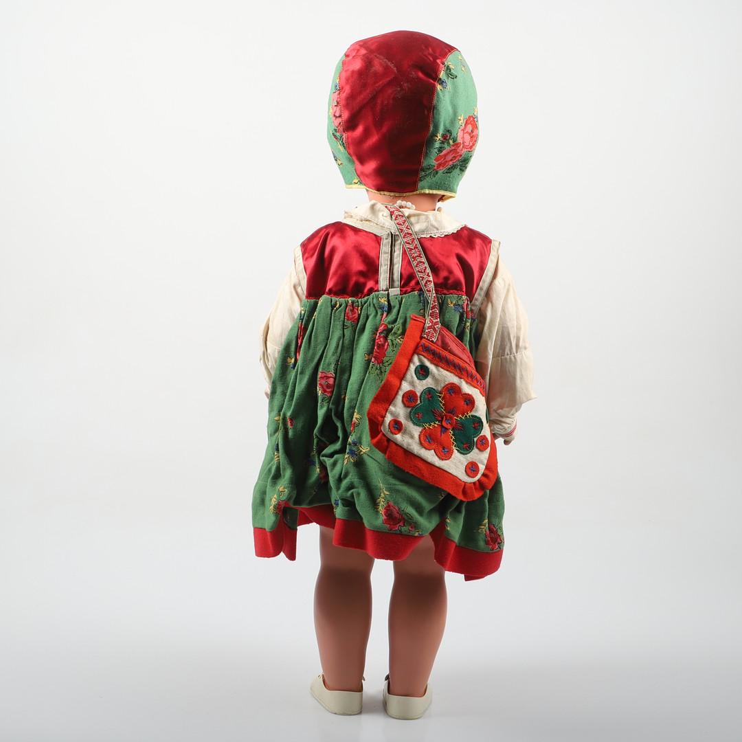 4340773. DOLL med folkedragt, skildpaddeemblem.