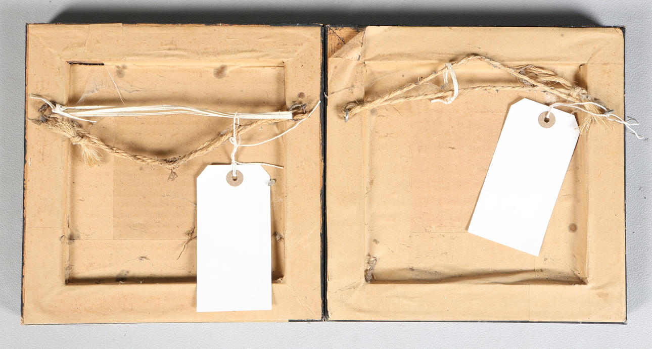 Forestiller en dame og herre i profil, hver anbragt i ahornglaserede rammer, hver 24 cm firkantet (2).