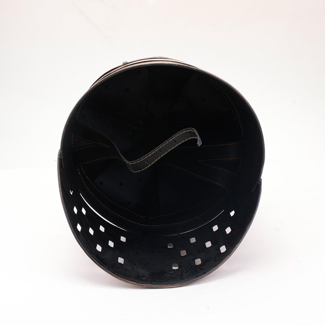 Hjelm i barbarisk, viking, fantasy stil, med horn og ører. Hjelmen er en moderne replika lavet i metal med imiteret læderforing.