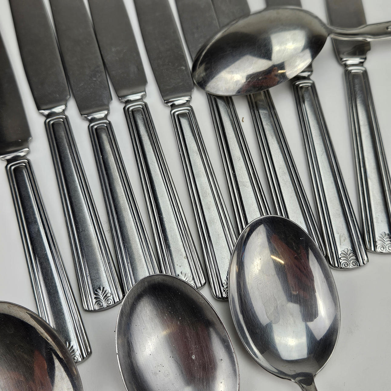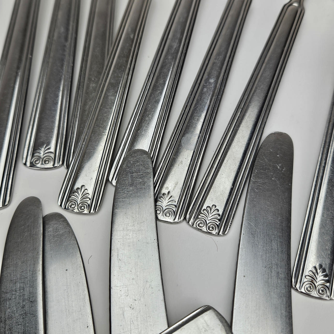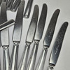 17 bordgafler, 16 bordknive, 2 knive med savtakket blad, 7 spiseskjeer.