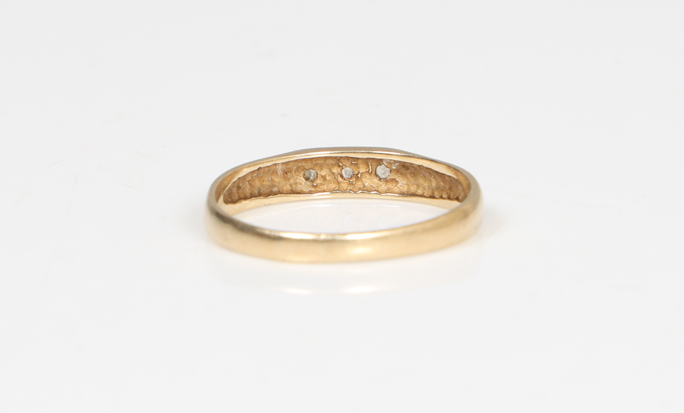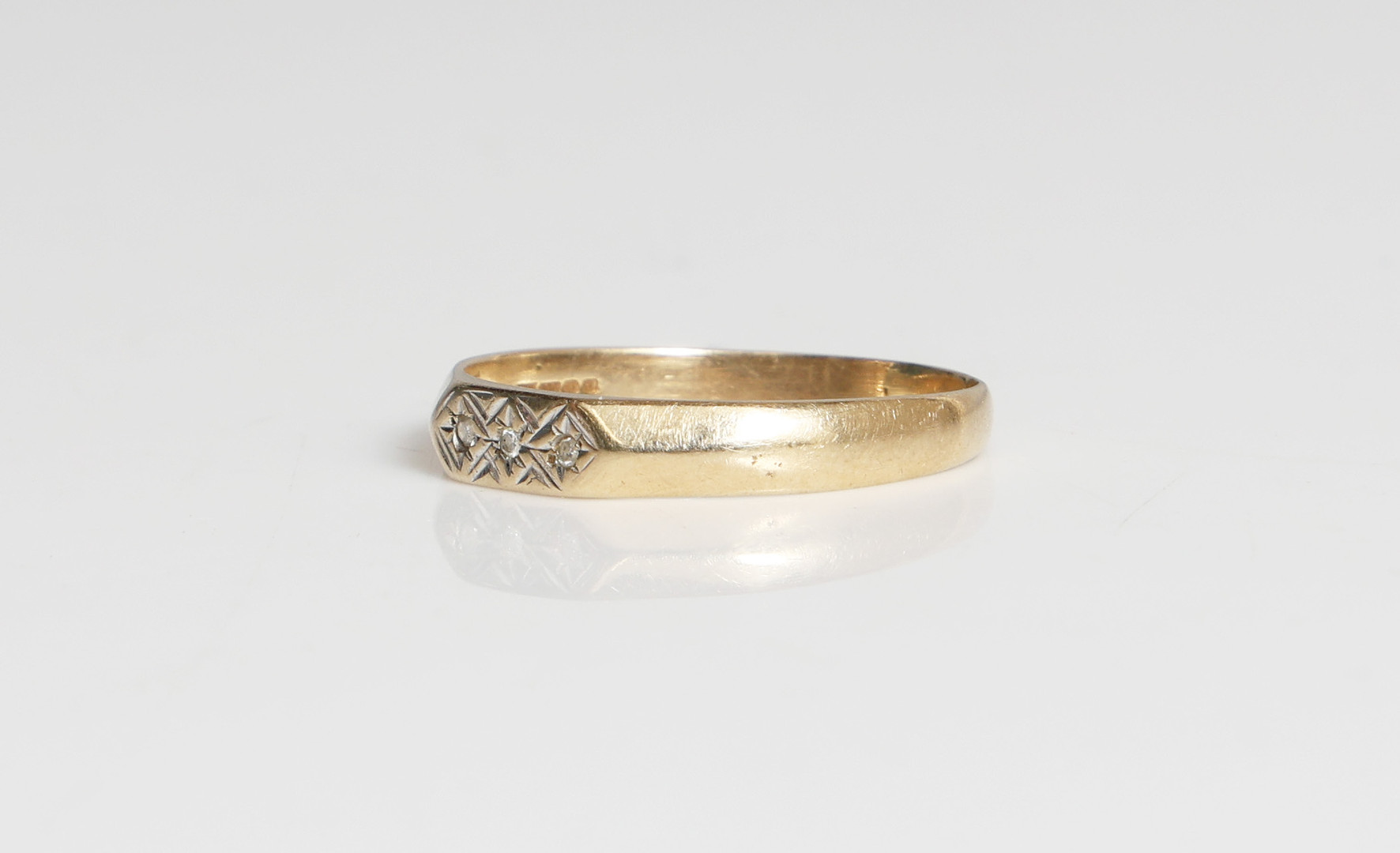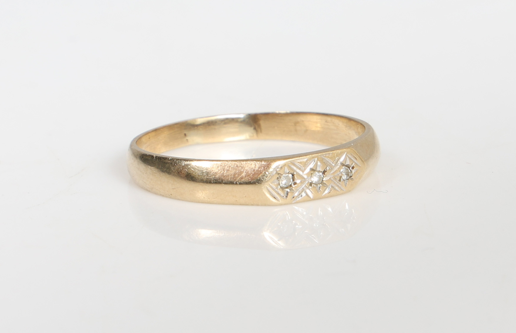 4344313. EN 9 KARAT GULD TRE STEN DIAMANT RING.