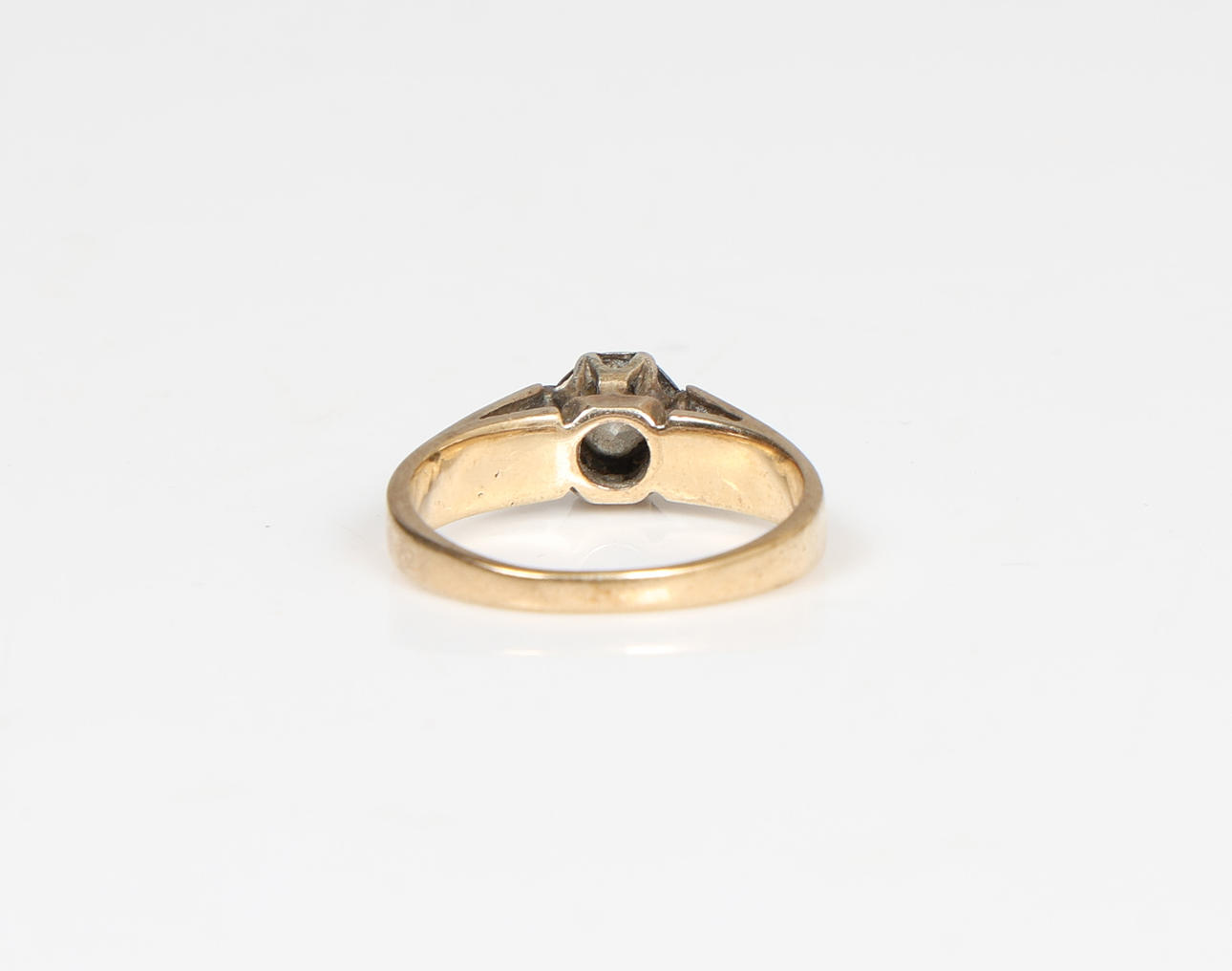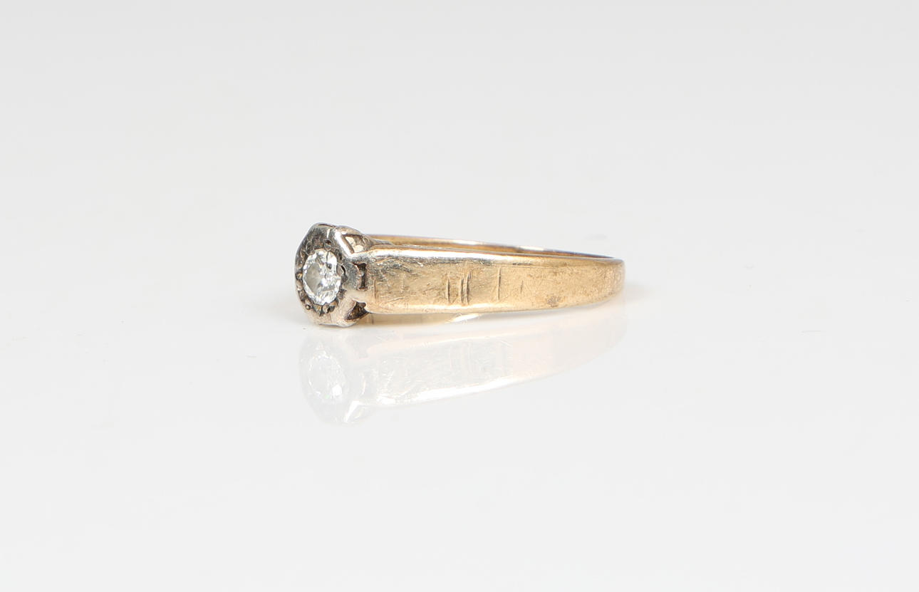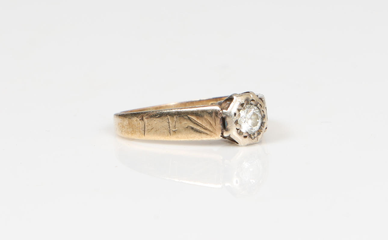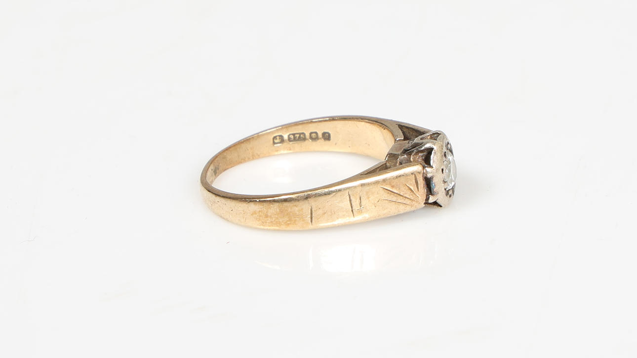 EN 9 KARAT GULD ENKELT DIAMANT SÆT RING.