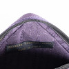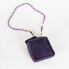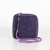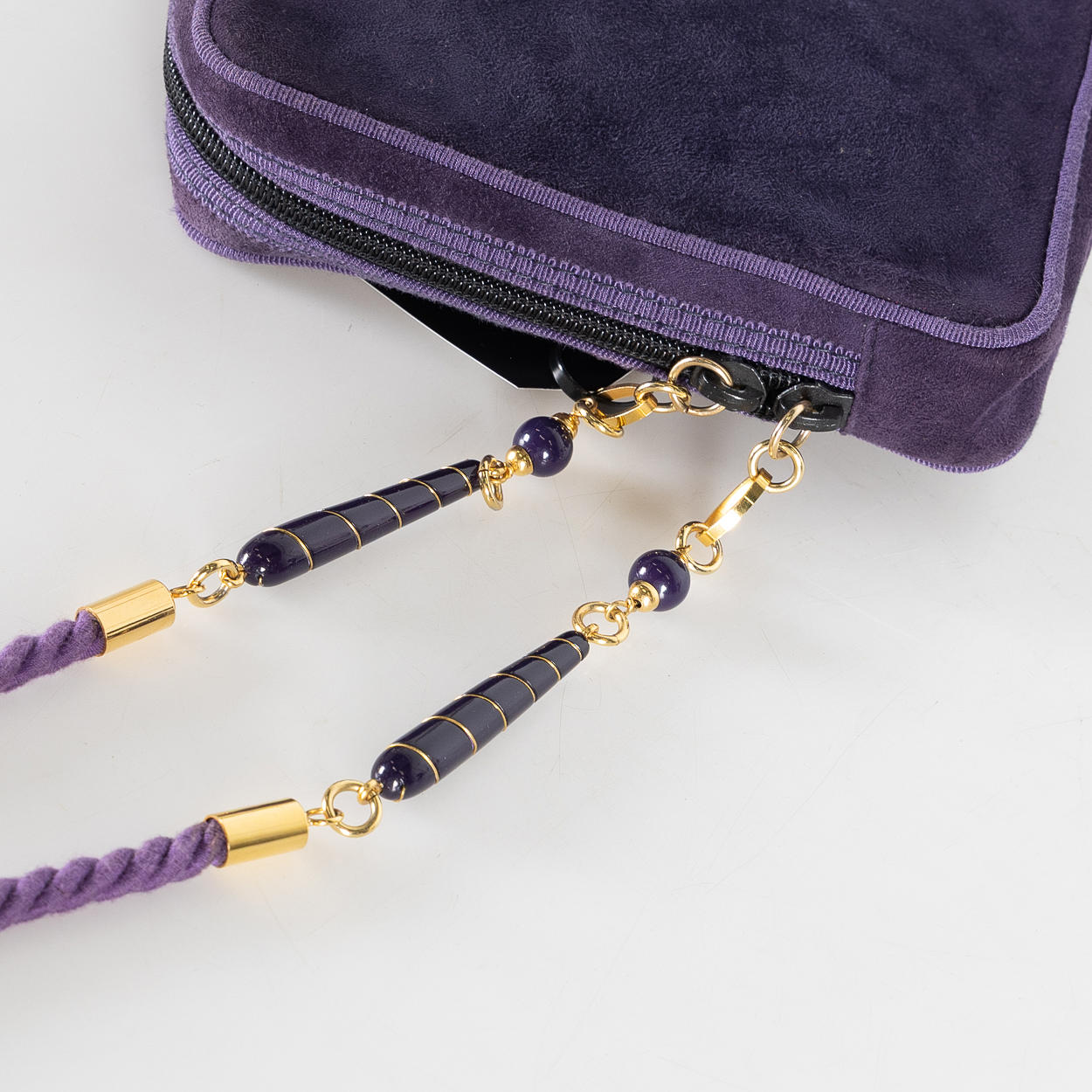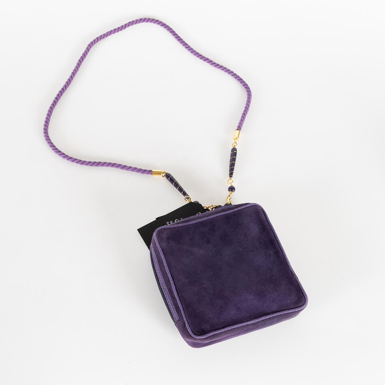 Firkantet taske i lilla ruskind med snoet skulderrem i lilla bomuld. Forgyldte metalled med lilla dekorative perler. Hovedrum med lynlås. Indvendigt lilla jacquardvævet foringsstof. Mærket CHARLES JOURDAN PARIS, fremstillet i Italien. Ca. 17x17x4 cm. Skulderstroppens fald ca. 60 cm.