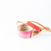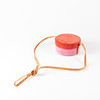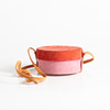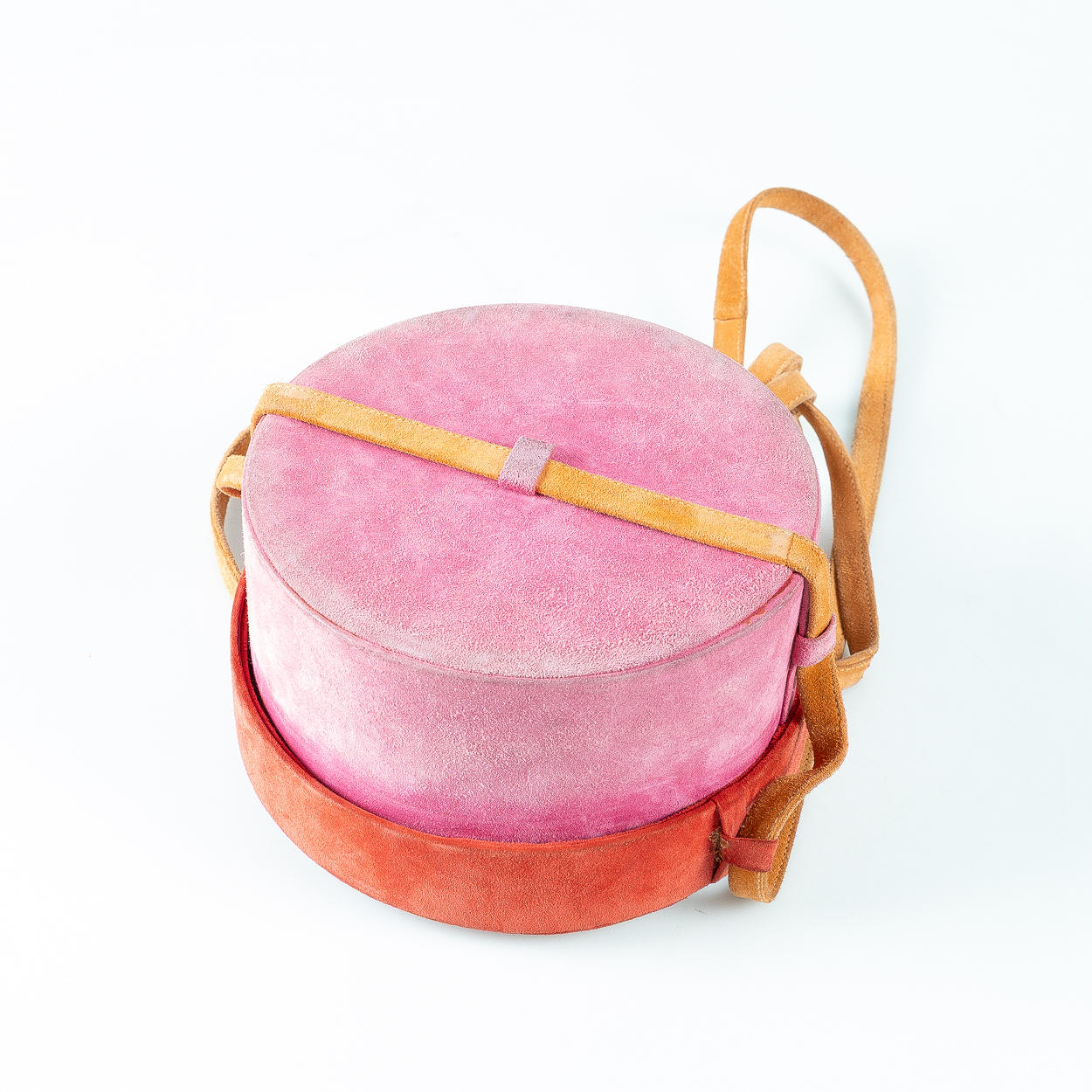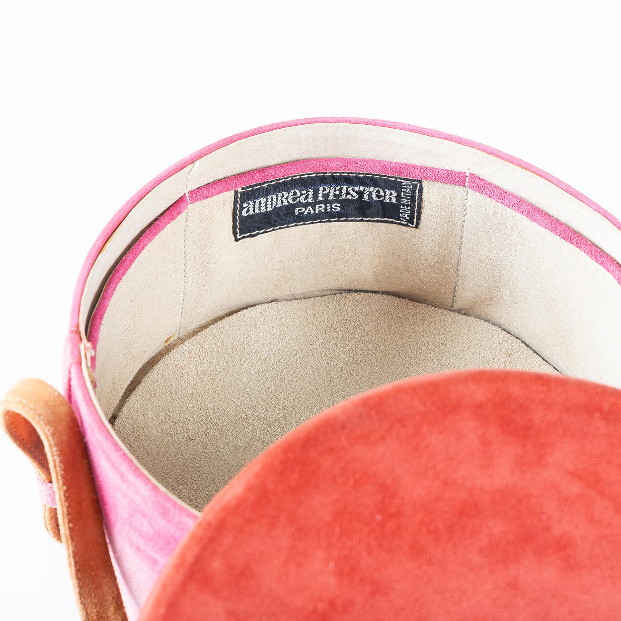 Rund taske klædt i rødt og lyserødt ruskind med orange skulderrem. Interiør i lys beige svineskind med små åbne rum langs kanten. Indvendigt mærket med etiket ANDREA PFISTER PARIS fremstillet i Italien. Diameter ca 17,5 cm, højde ca 8,5 cm. Skulderrem ca. 80 cm.