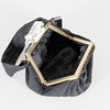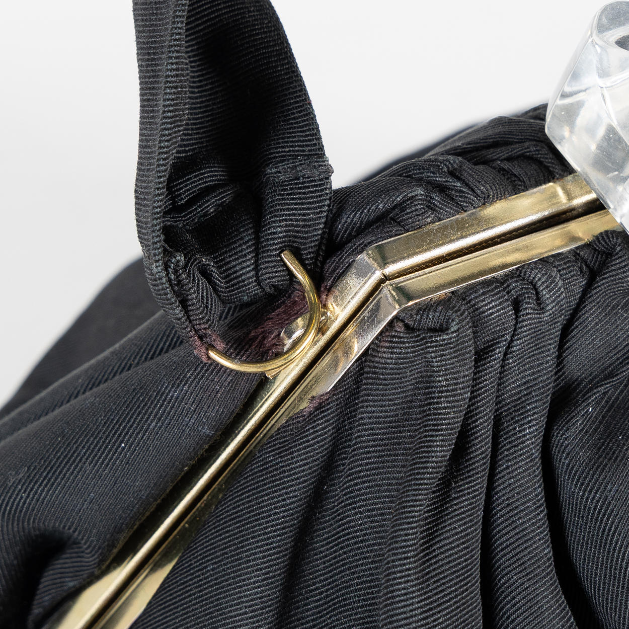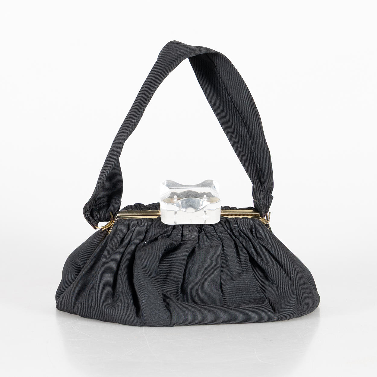 i sort ribbet tekstil med plexiglas lås. Forgyldt taskegenser i metal, sort foringsstof. Aftagelig rem.