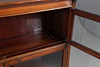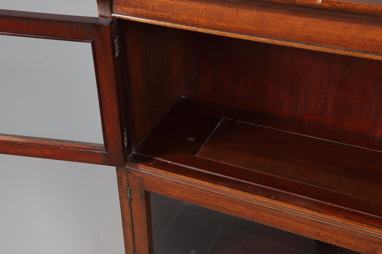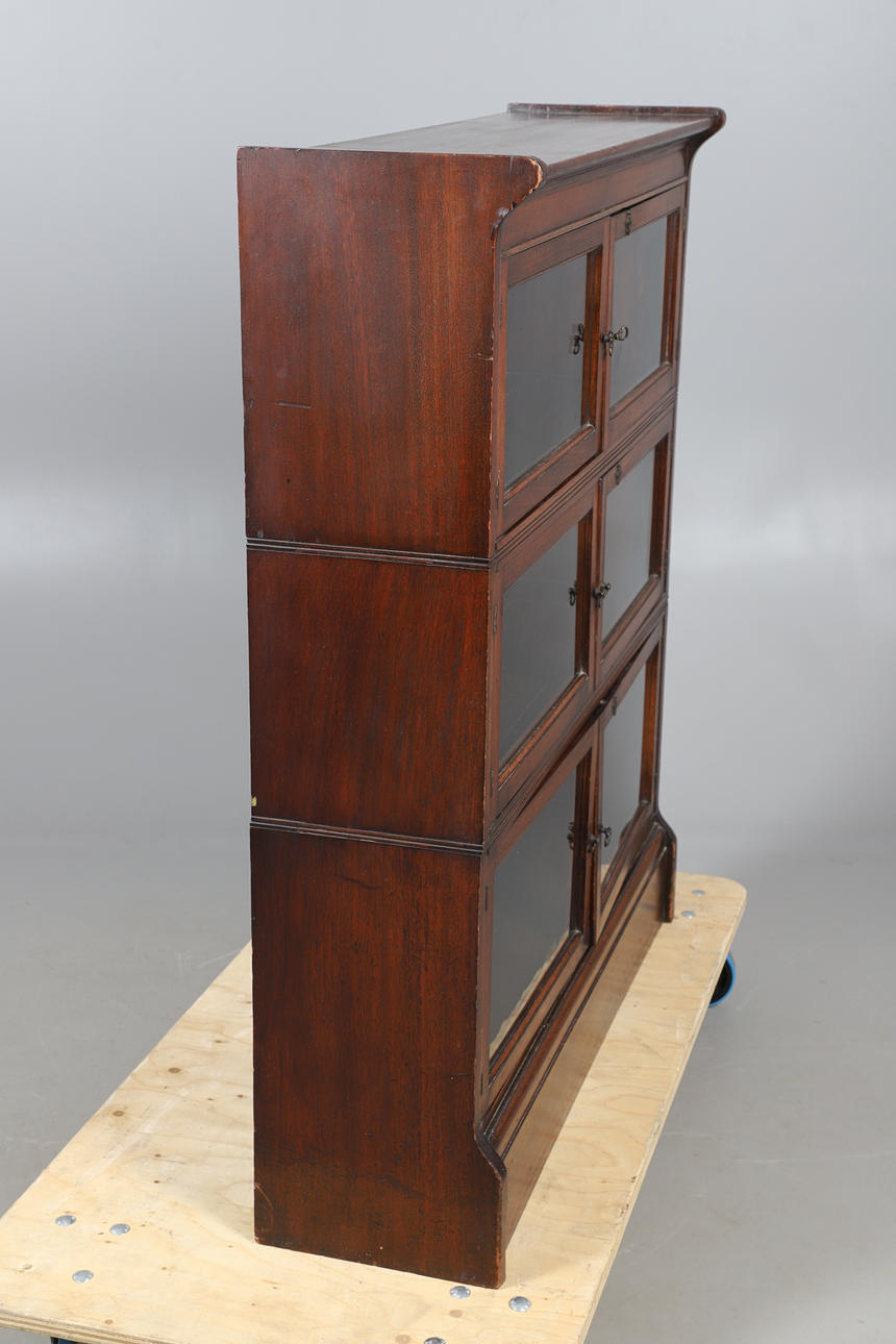 En reol med tre sektioner med glaserede døre til hver sektion, med en detailetiket på bagsiden. 104 cm høj, 88 cm på tværs.