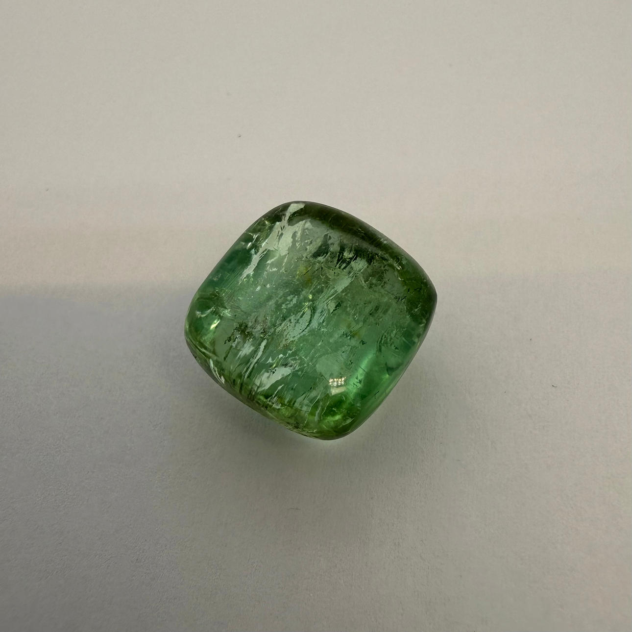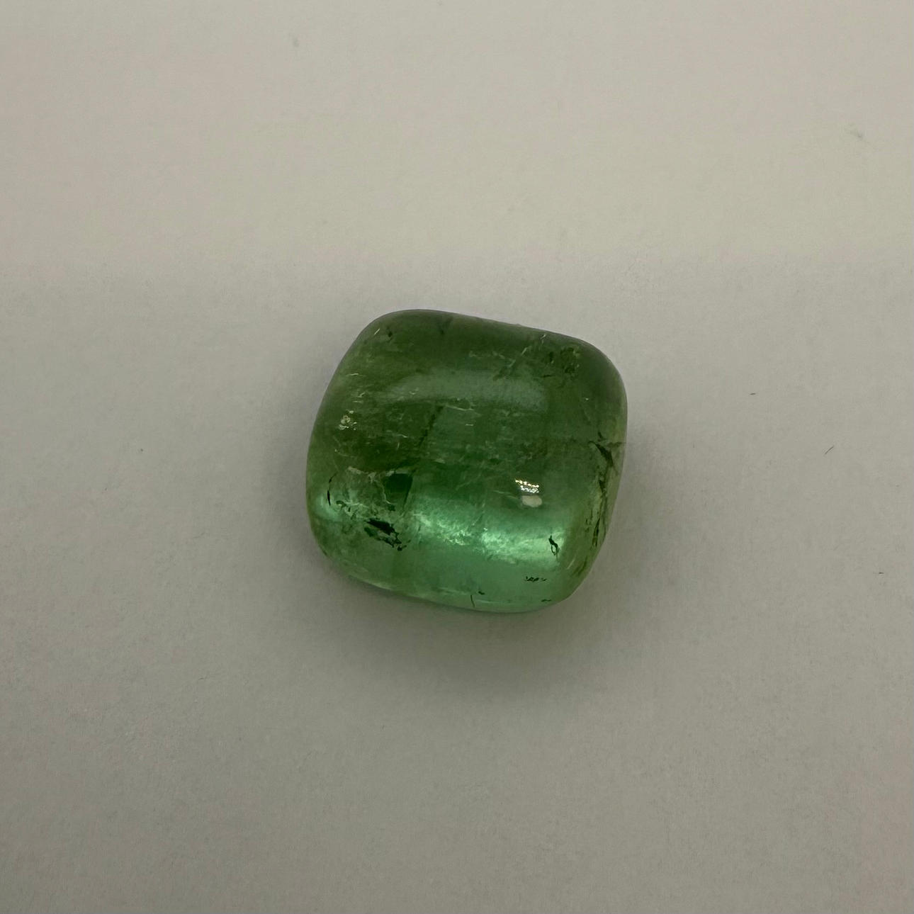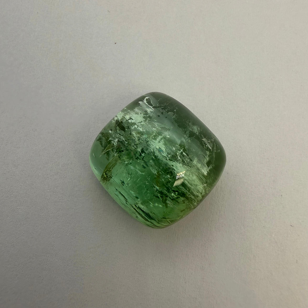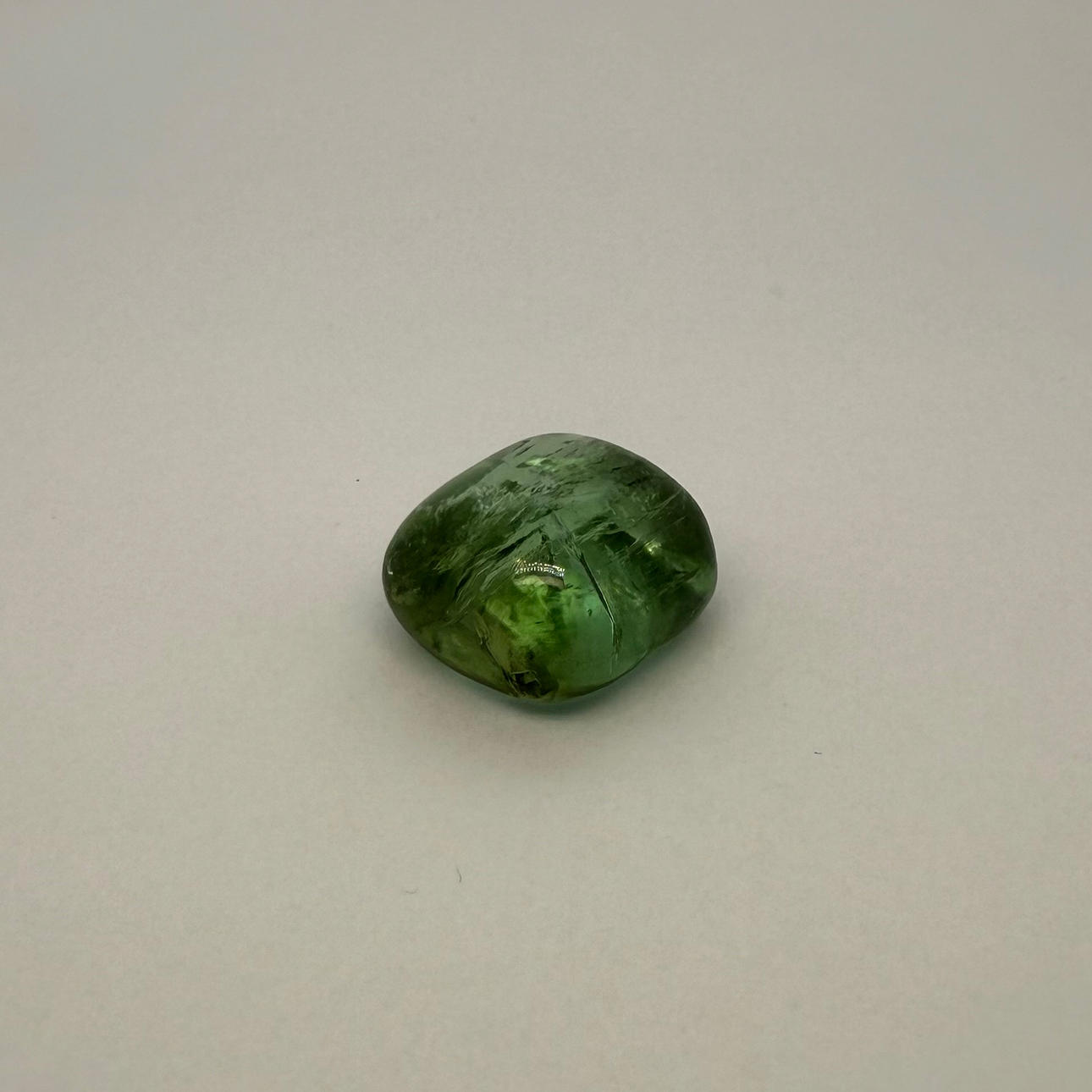 En cabochonskåret naturlig turmalin 29,3 karat i lysegrøn farve, gennemsigtig med synlige indeslutninger.