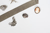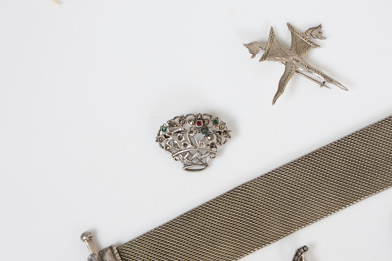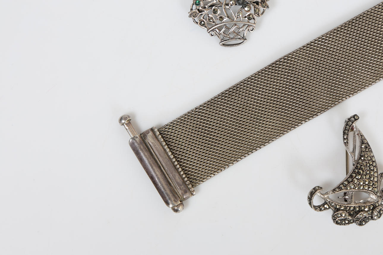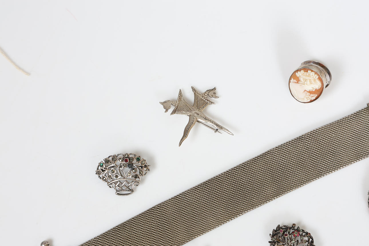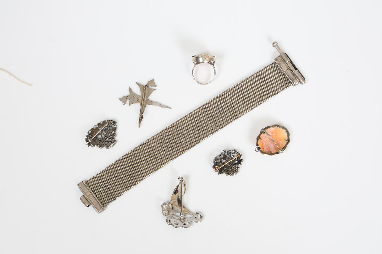 Inkluderer et hvidt metalarmbånd i form af et 20 cm langt bælte, en sølv cameo ring, en cameo-broche, to hvide metalblomsterbrocher, en sølvbådbroche sammen med en mellemøstlig hvidmetalbroche, samlet vægt 97,6 gram.