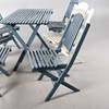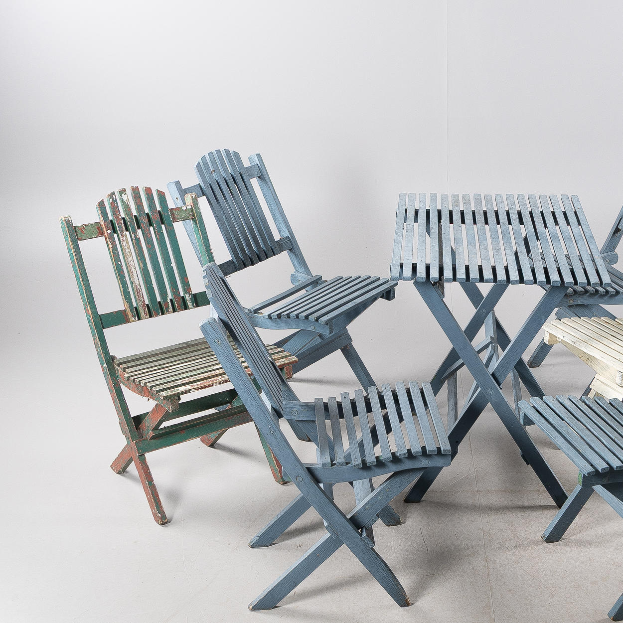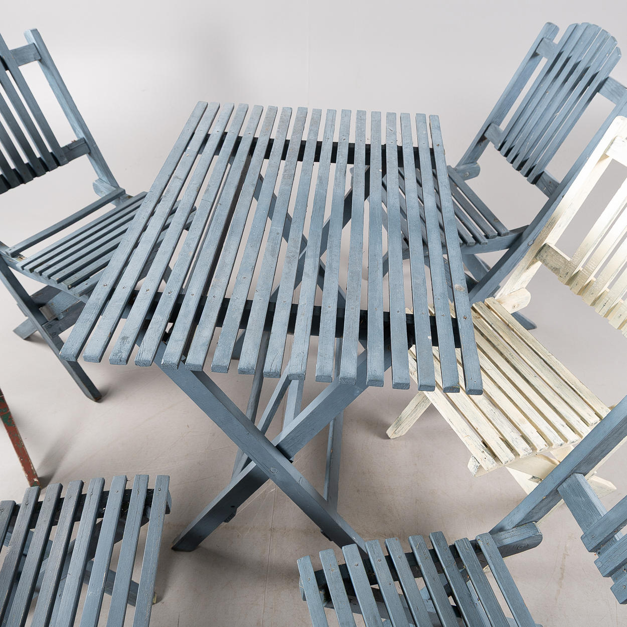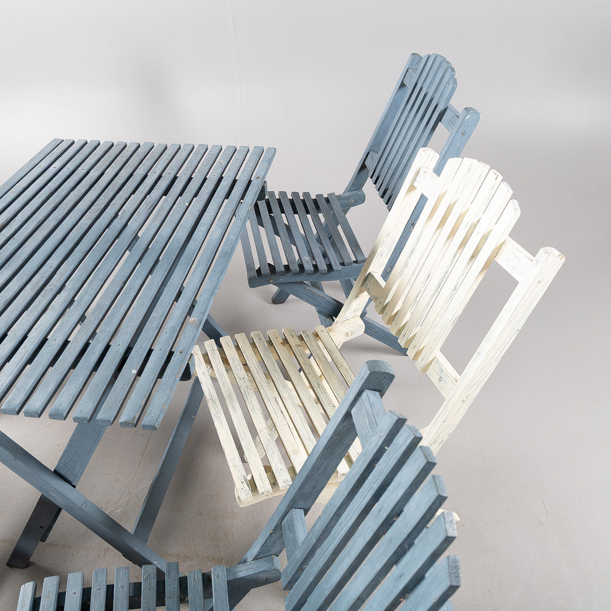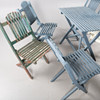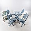Sammenfoldelig, bestående af Bord, højde 75, 90 x 59 cm 6 stole, højde 87, sædehøjde 45 cm.