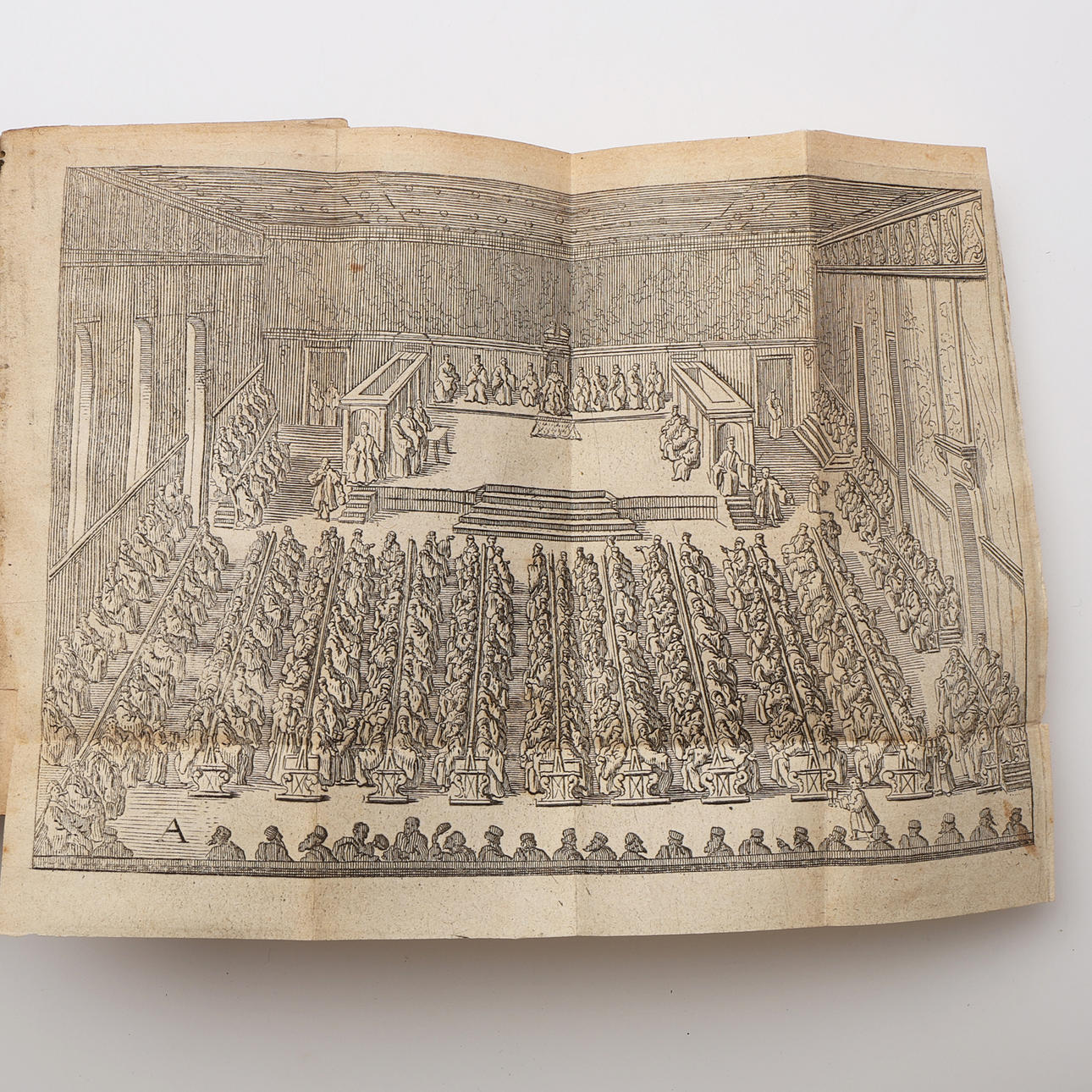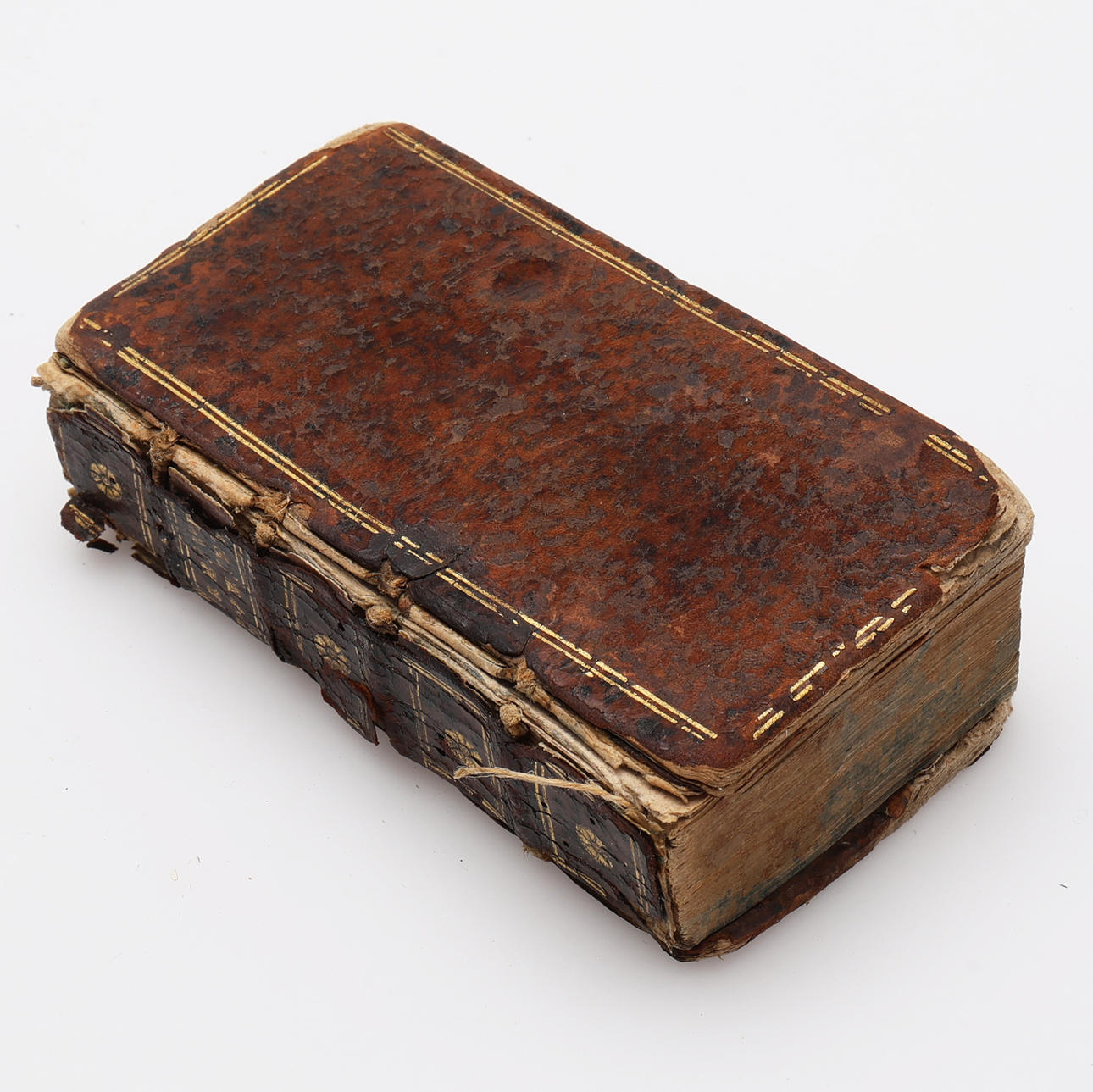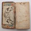 Båndet er hårdt slidt og gnidt Frontbind for det meste løst. Indlægget let lagdelt farvet. Et par koppar med små huller.