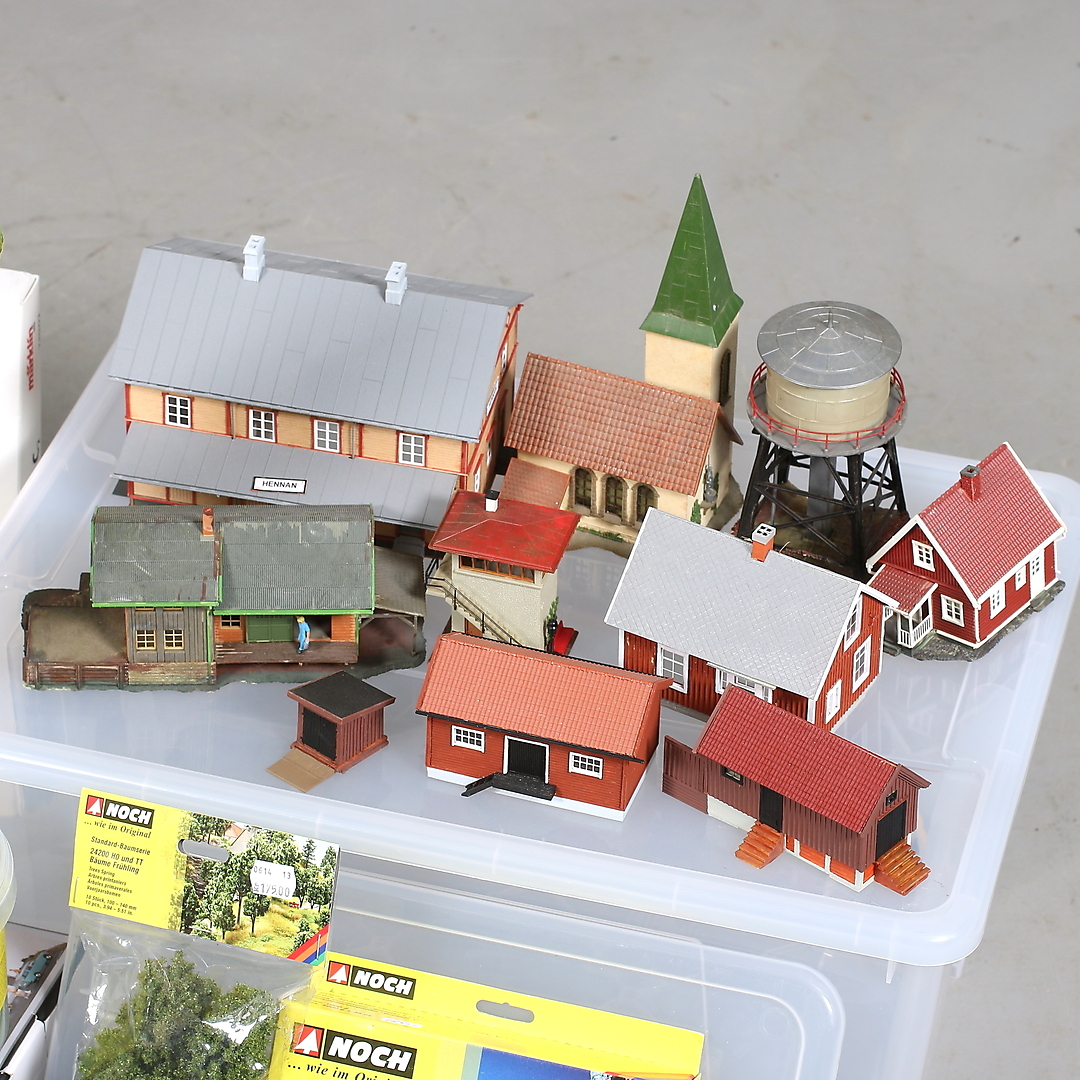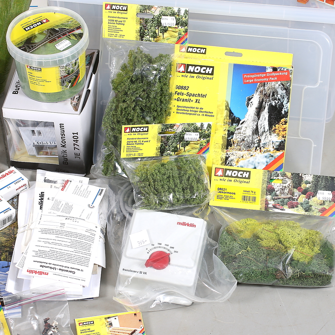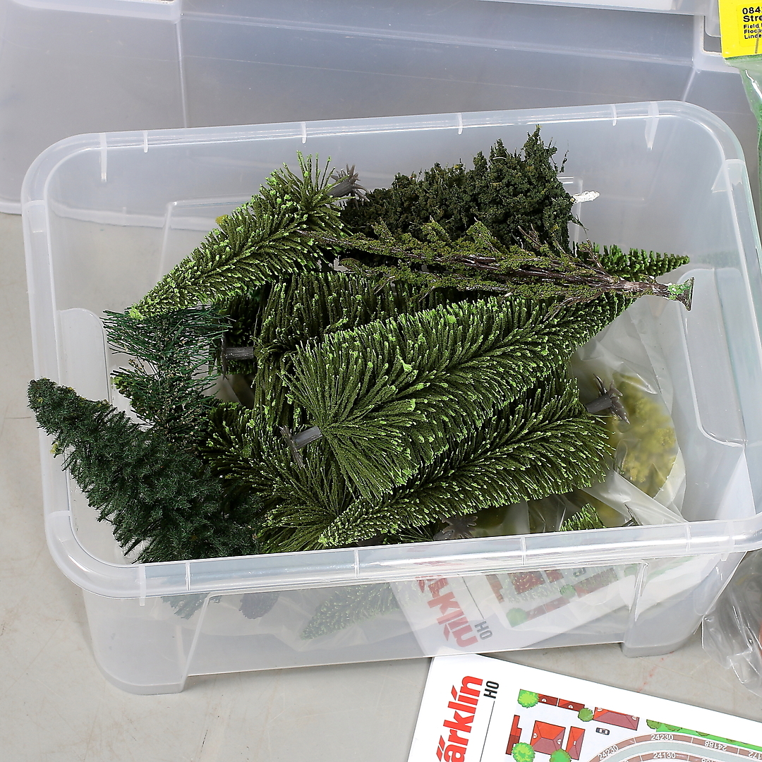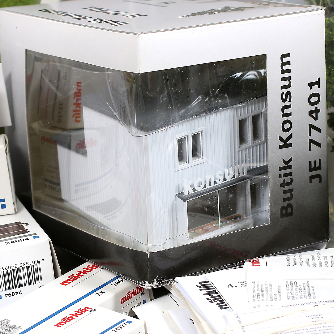 434953. MÄRKLIN, H0, 128 dele, skinner, hus og dekorationsmateriale.
