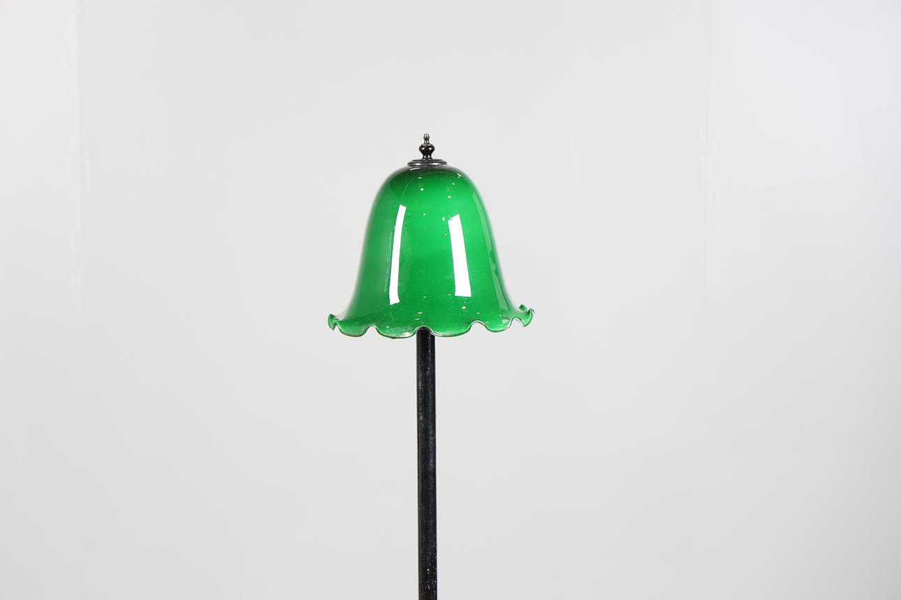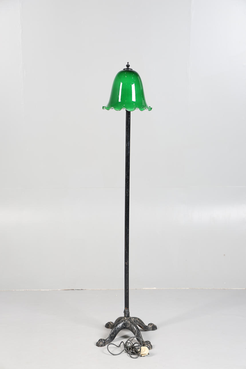 Med grøn glasskærm med flæser, hævet på smedejernsbund med rulleben, 153 cm høj ca.
