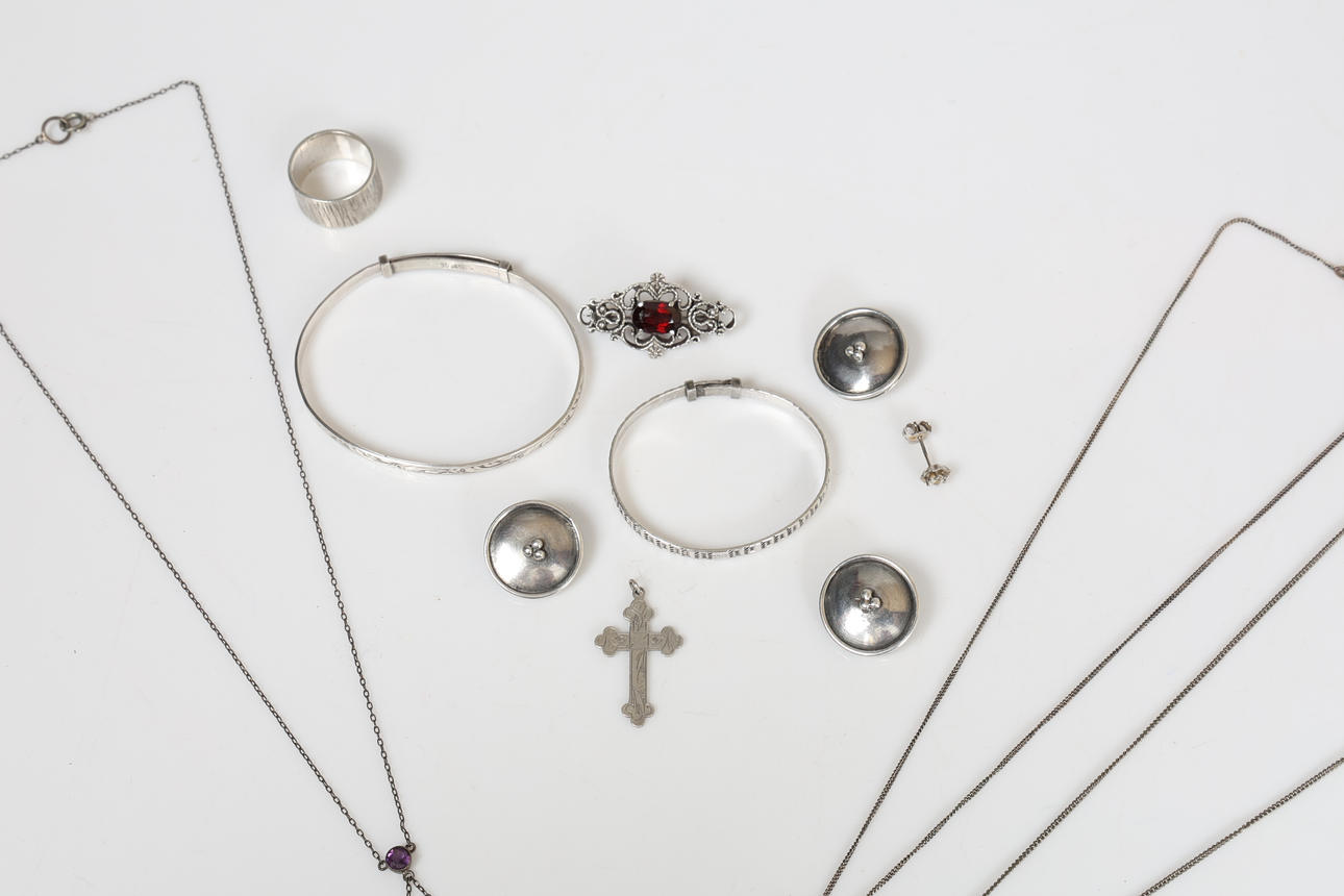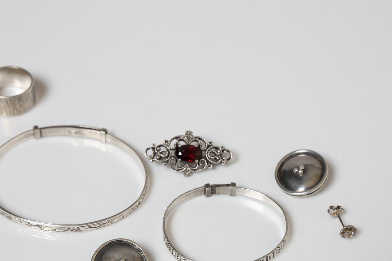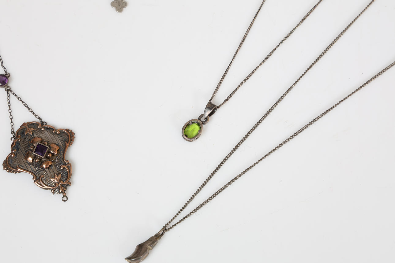 Inkluderer et vedhæng monteret i sterlingsølv og 9 karat guld, en sølvbroche, et sølvarmbånd, en samling af hvide metalhalskæder, armbånd, ring, knapper osv. (antal).
