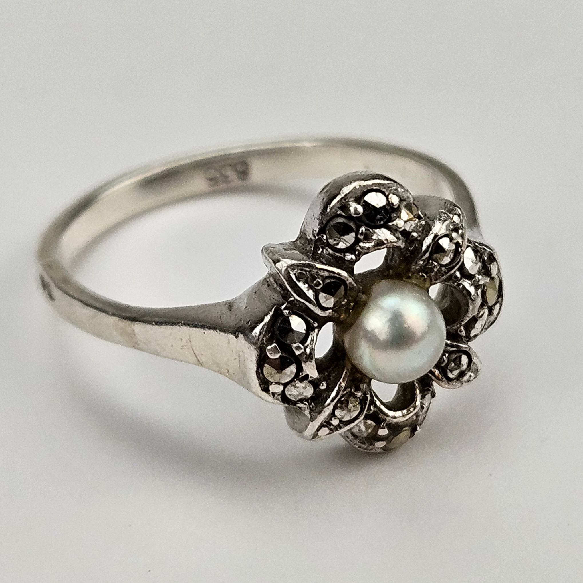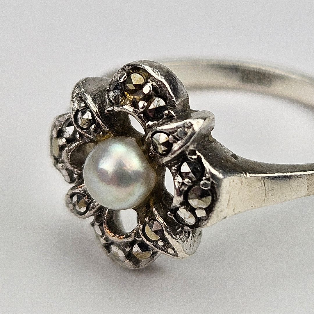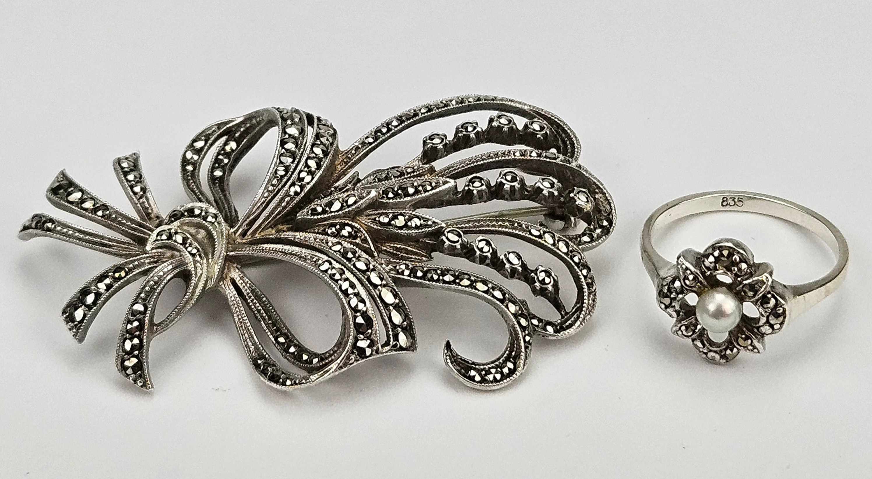4352126. BROCHE OG RING, sølv, med markasitter og perle.