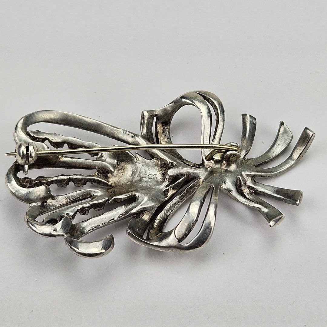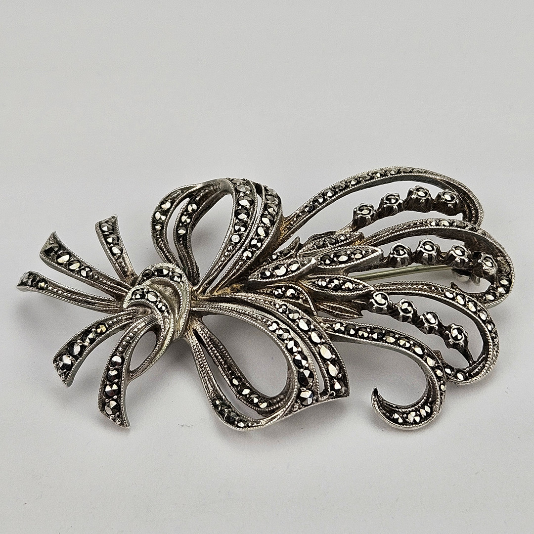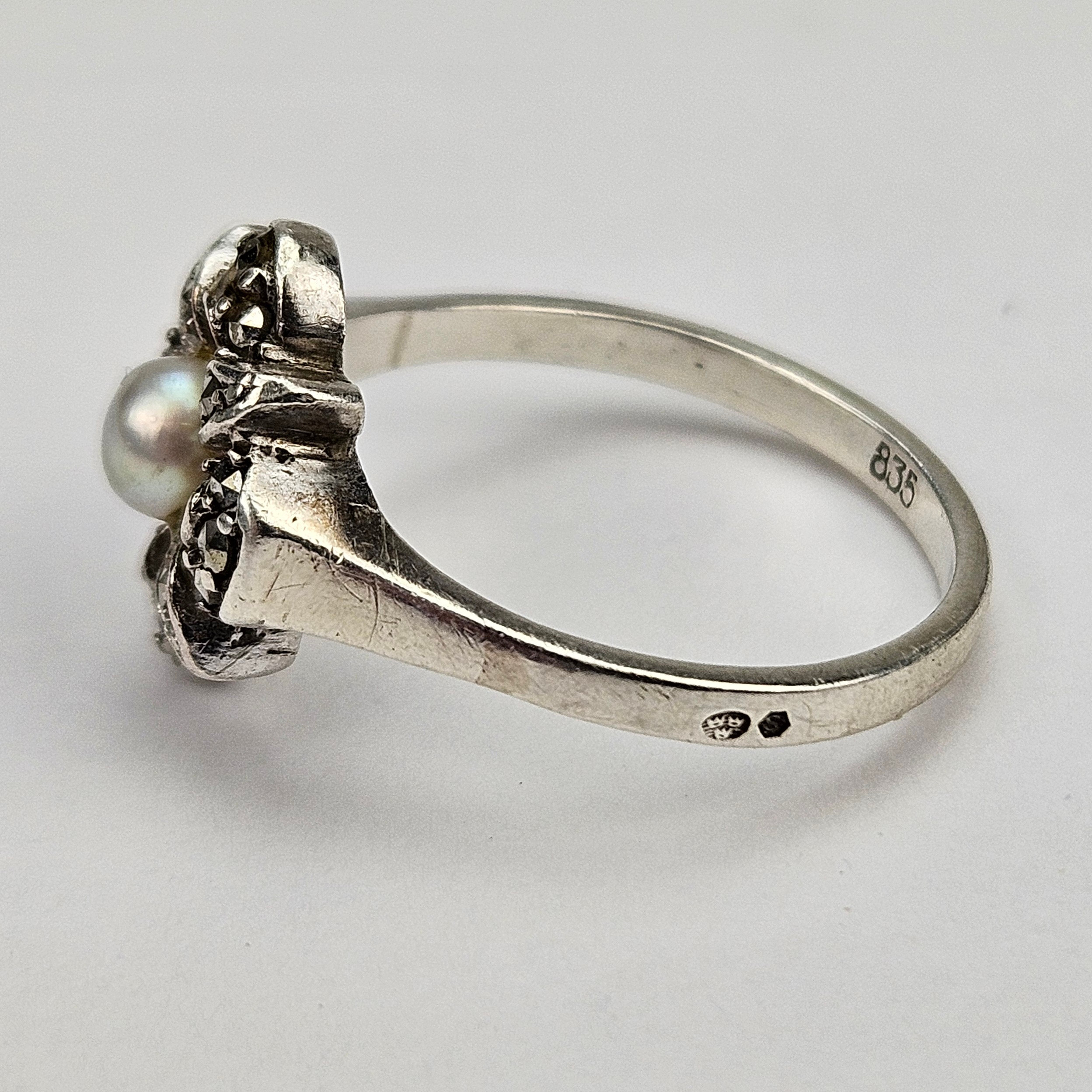 4352126. BROCHE OG RING, sølv, med markasitter og perle.