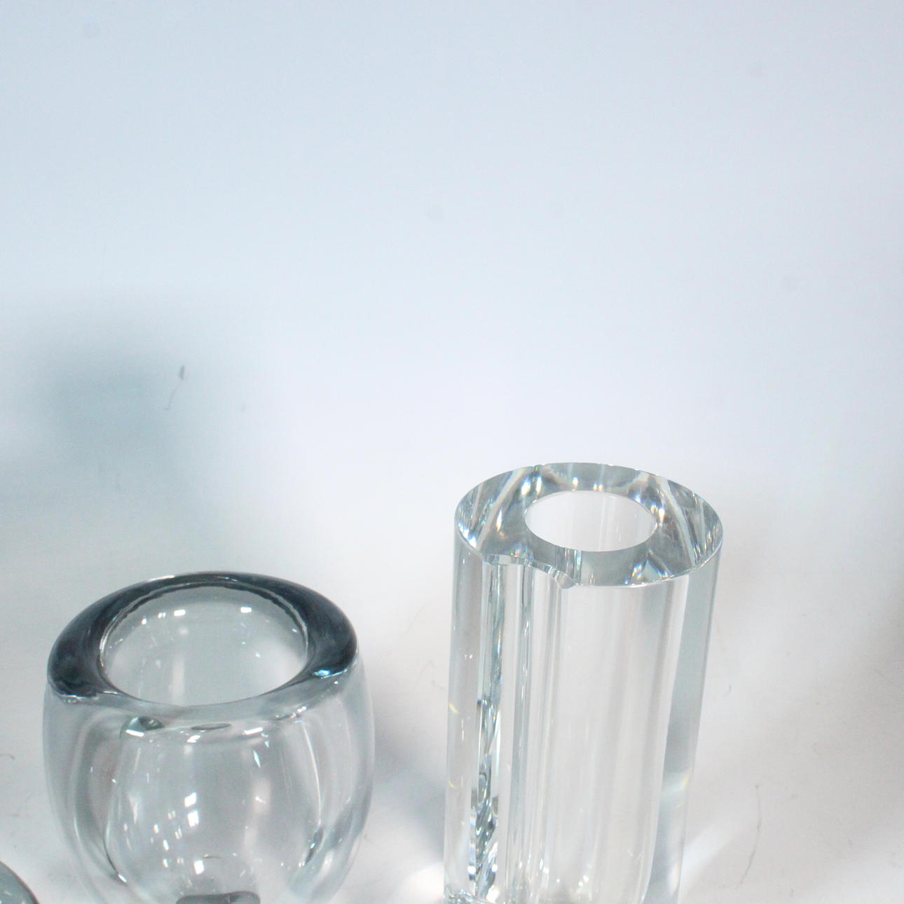 En samling glasvaser med bl.a. Per Lütken til Holmegaard lavet af glas.