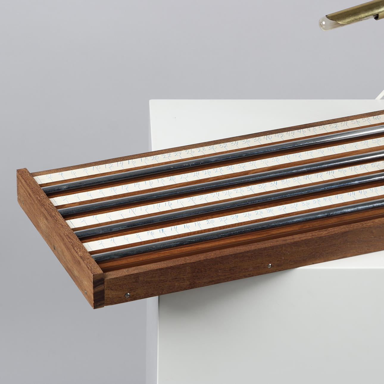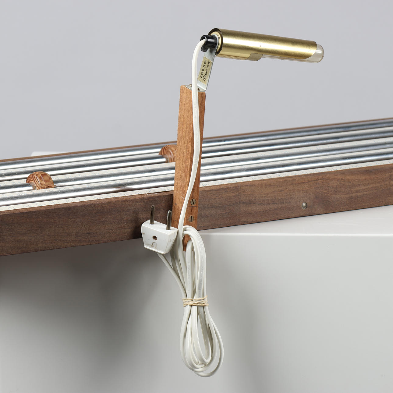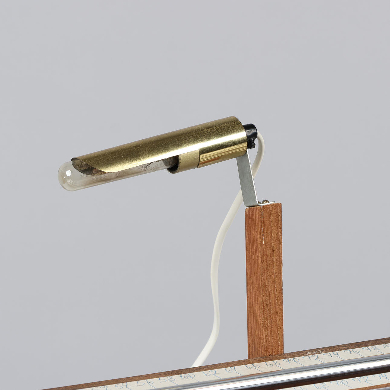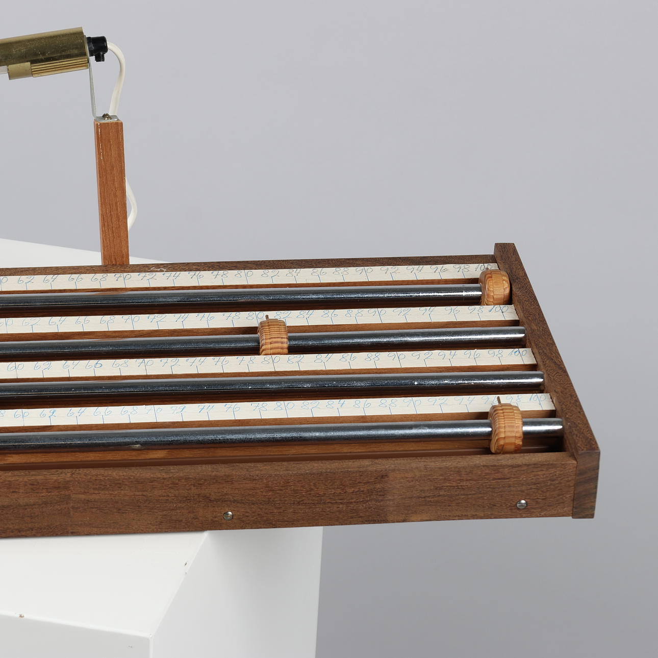 Skydetavle af massiv mahogni og fyrretræ med forkromede rør, til kegle eller carambolebillard, monteret med lys. For 4 spillere op til 100 point. Mål 87 x 28 x 5 cm.