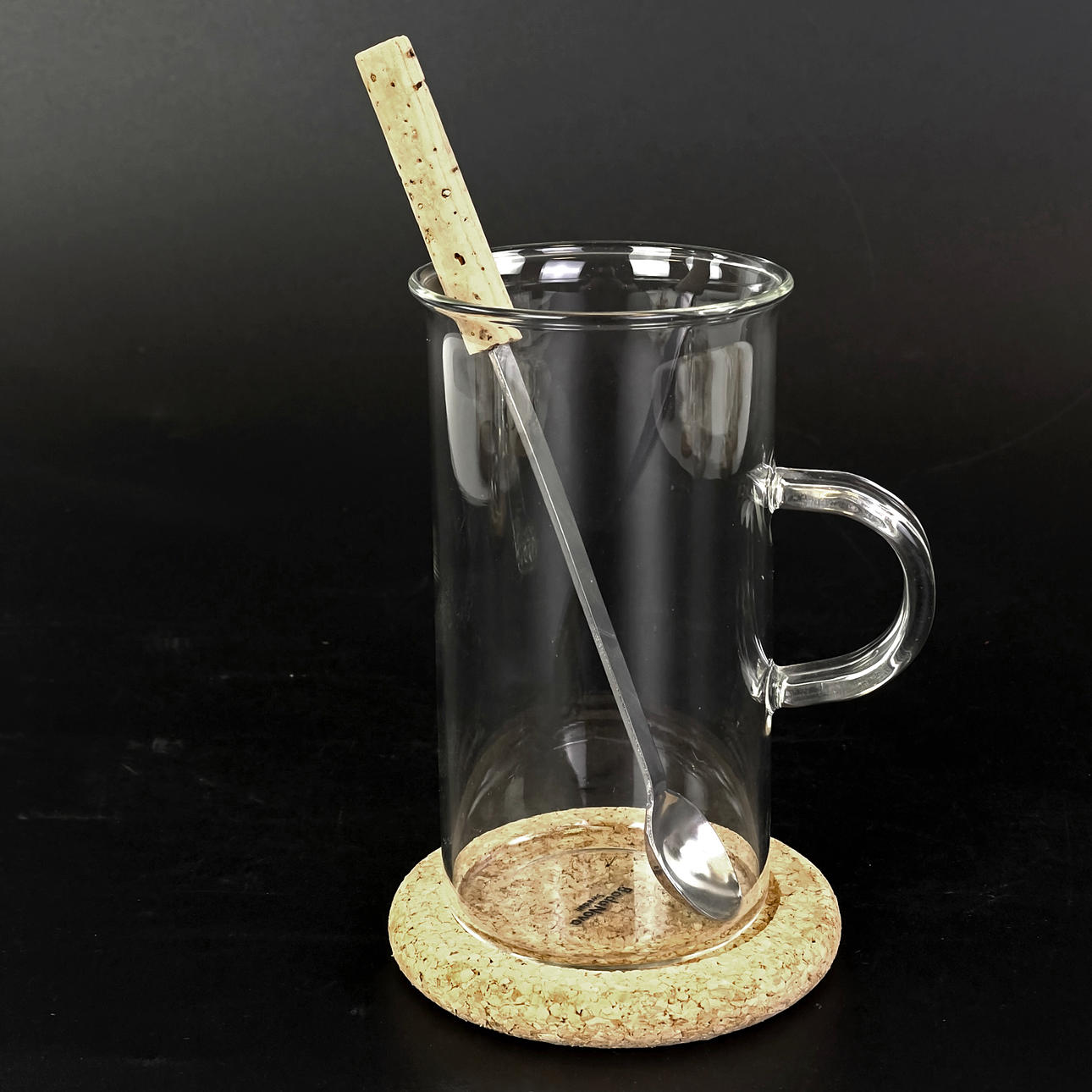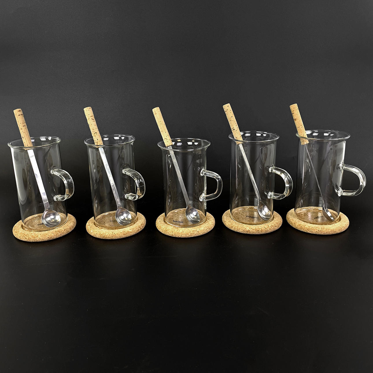 5 irske kaffeglas med korkbund hvoraf 1 med smalere øre, design Signe Persson Melin, Boda Nova, højde ca. 12 cm.