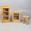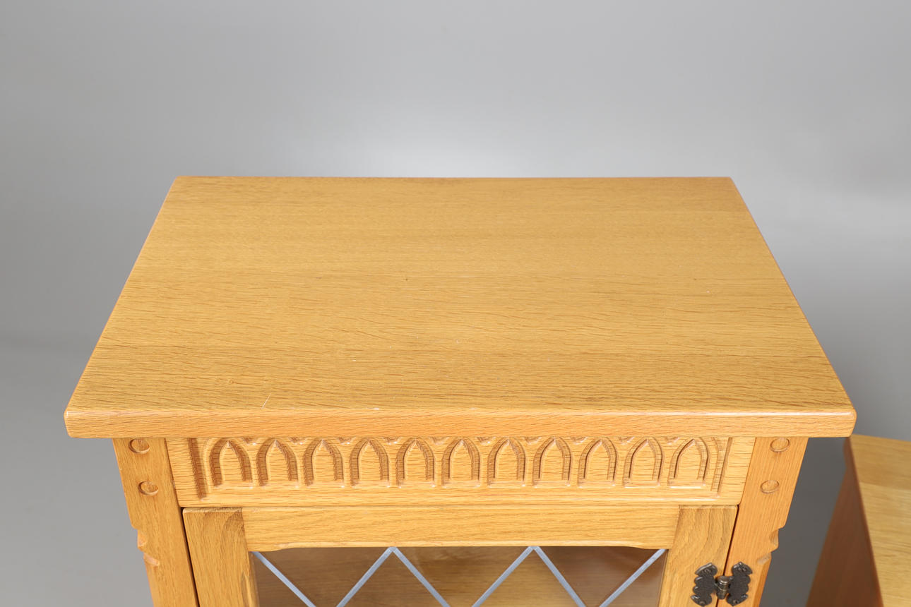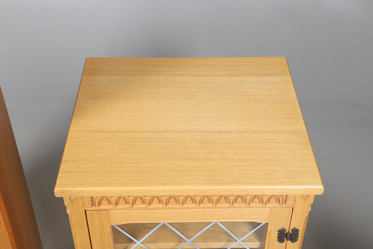 Inkluderer et enkelt astragalt glasdørskab med to indvendige hylder (Højde 101 cm x Bredde 51,5 cm x Dybde 33 cm), et mindre lignende skab og et lille sidebord med drejede understøtninger, forenet af en rektangulær båre. (3).
