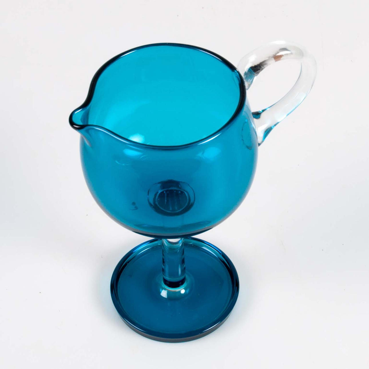Flødekande til fod i blåt glas fra serien Harlekiini (Harlequin), model 1193, designet af Nanny Still for Riihimäen Lasi i Finland. Serien blev produceret mellem 1958 og 1968. Kanden har rund kop, tud og klart glashåndtag