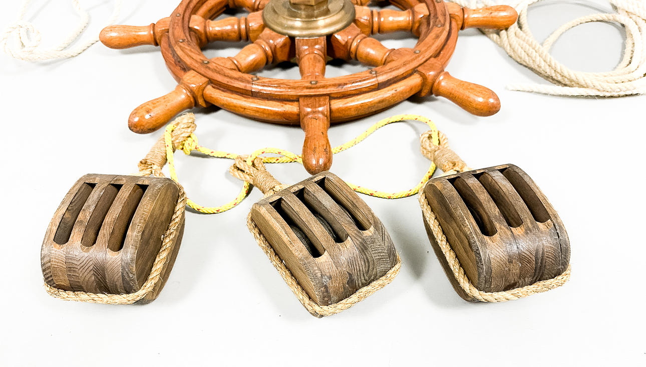 4353686. BÅDRAT & BLOK, 6 dele, træ, messing, 20. århundrede.