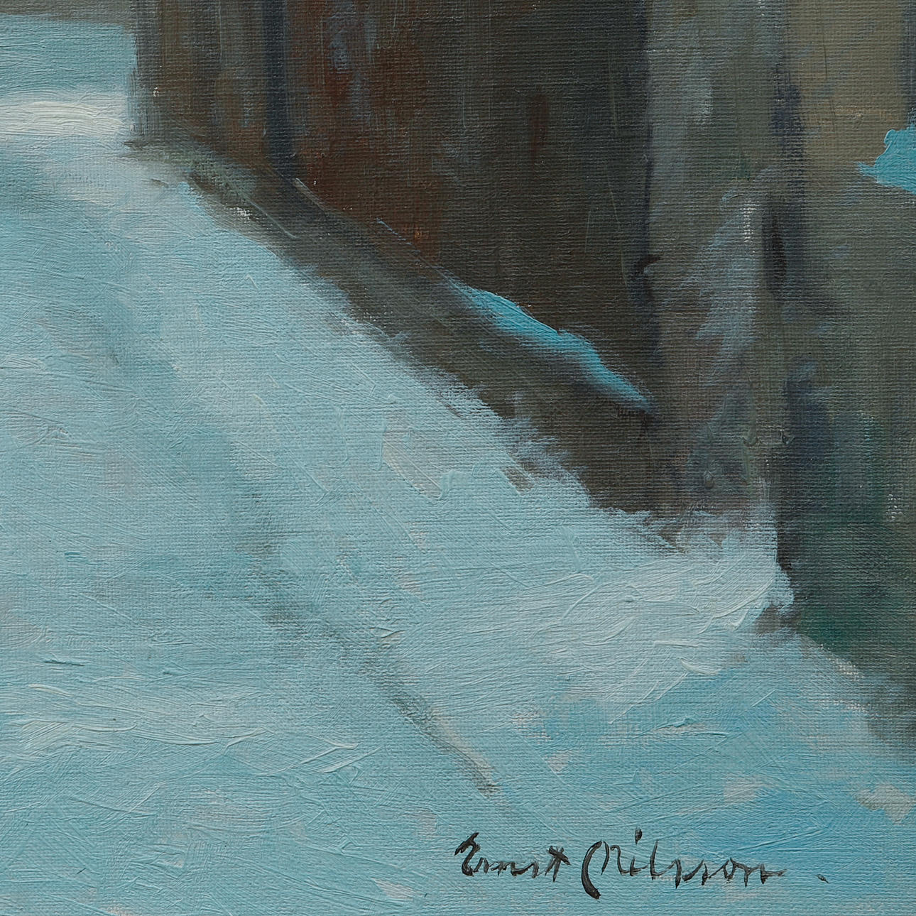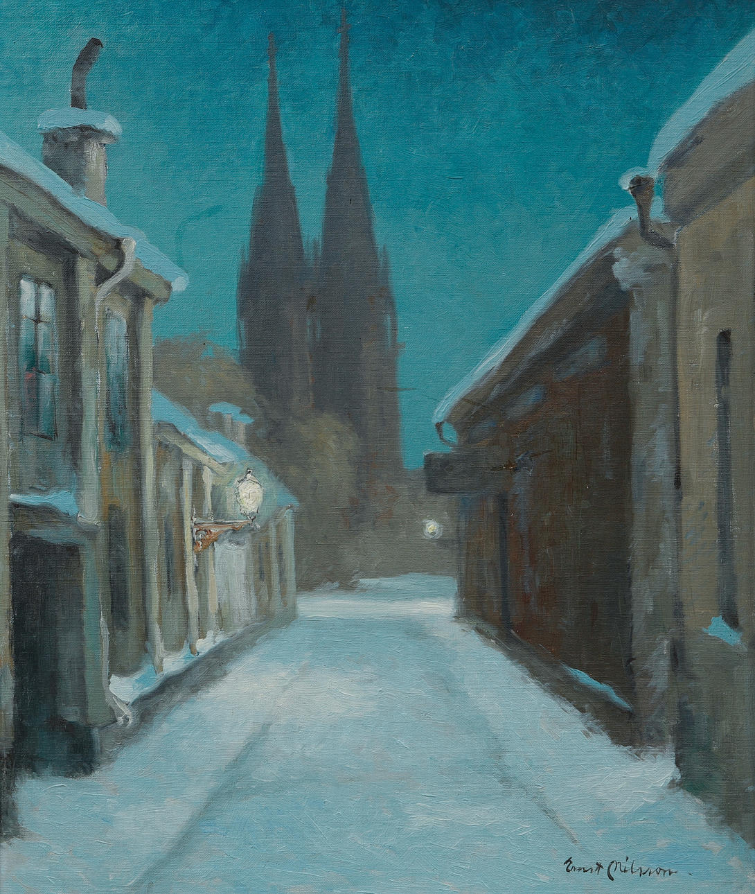 ERNST NILSSON. Bybillede i vinterplade, olie på panel, signeret.