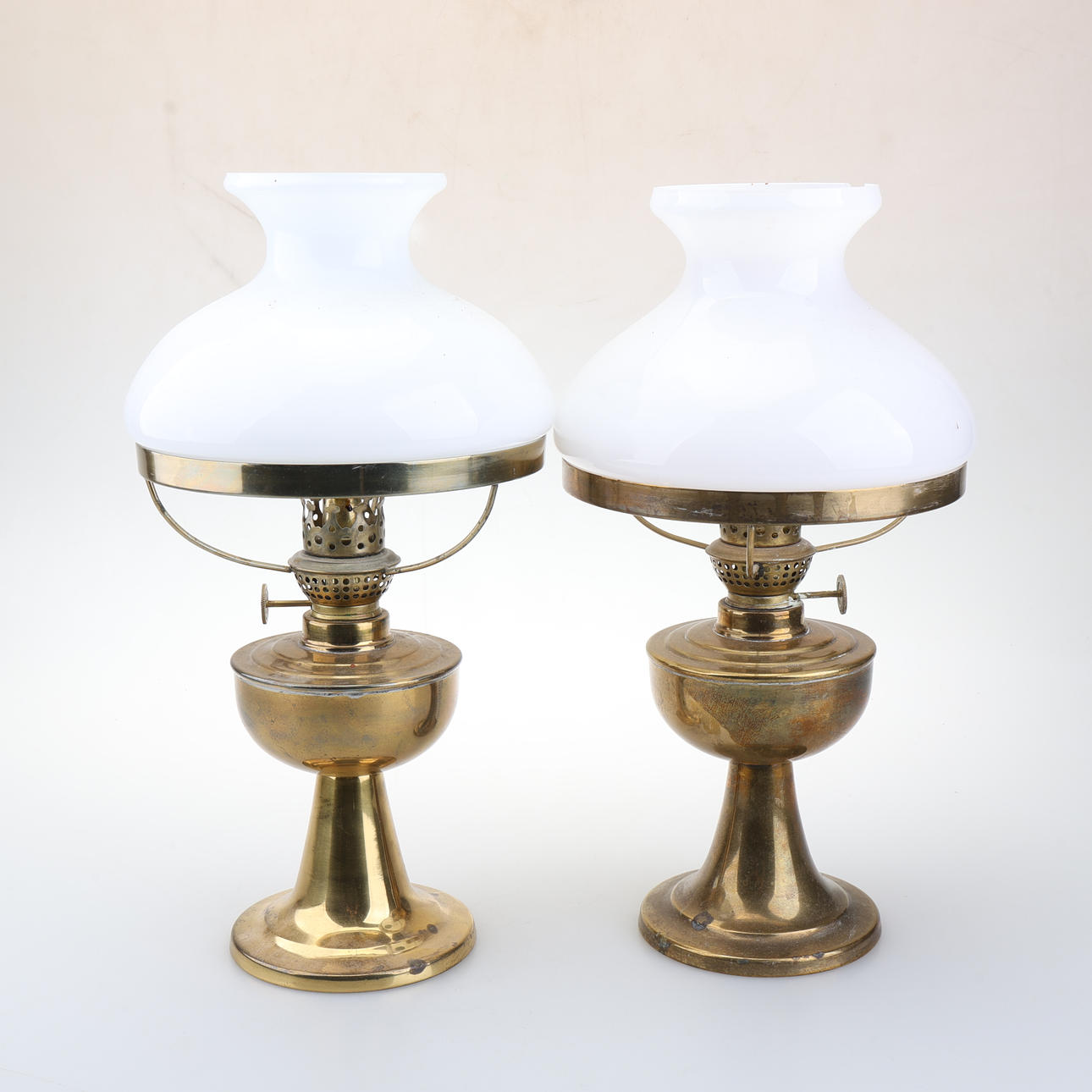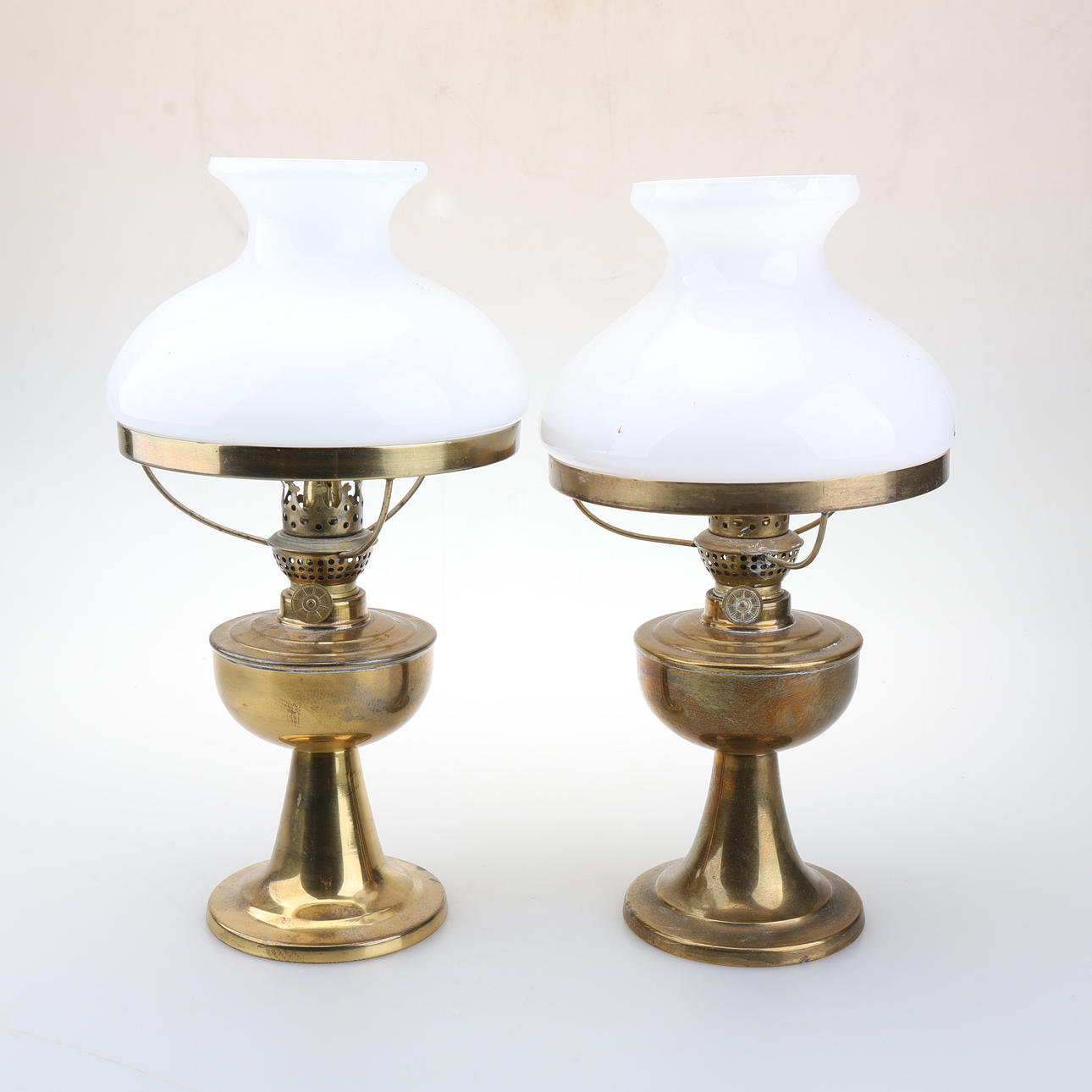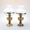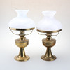 PETROLEUMSLAMPER, et par, messing/glas, 1900-tal.