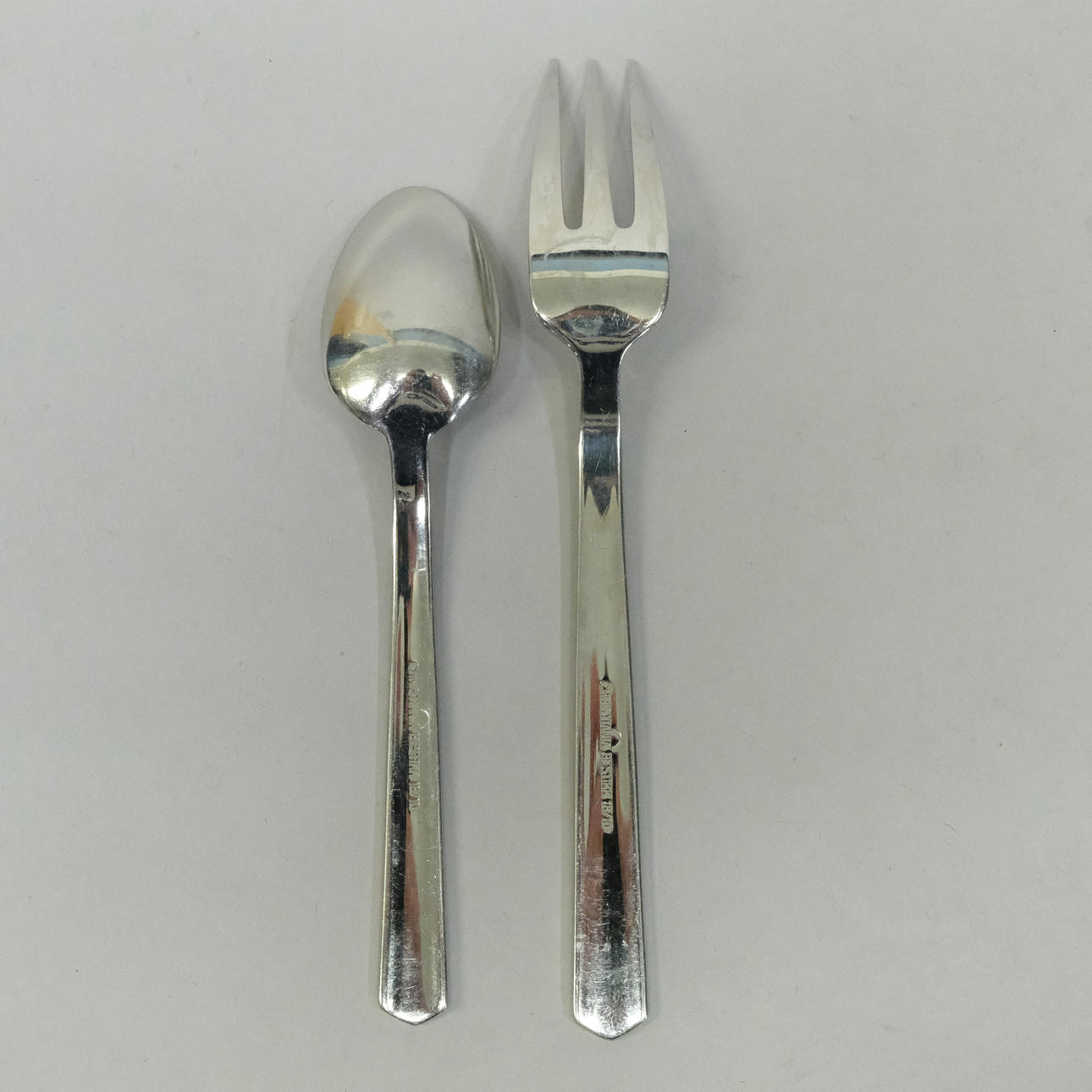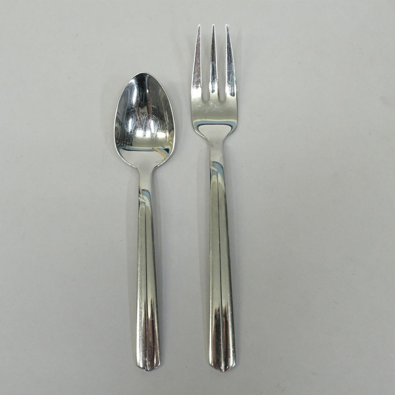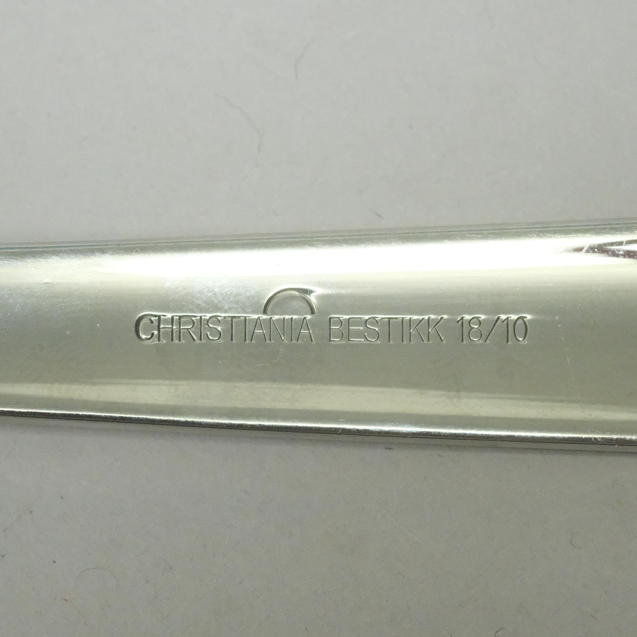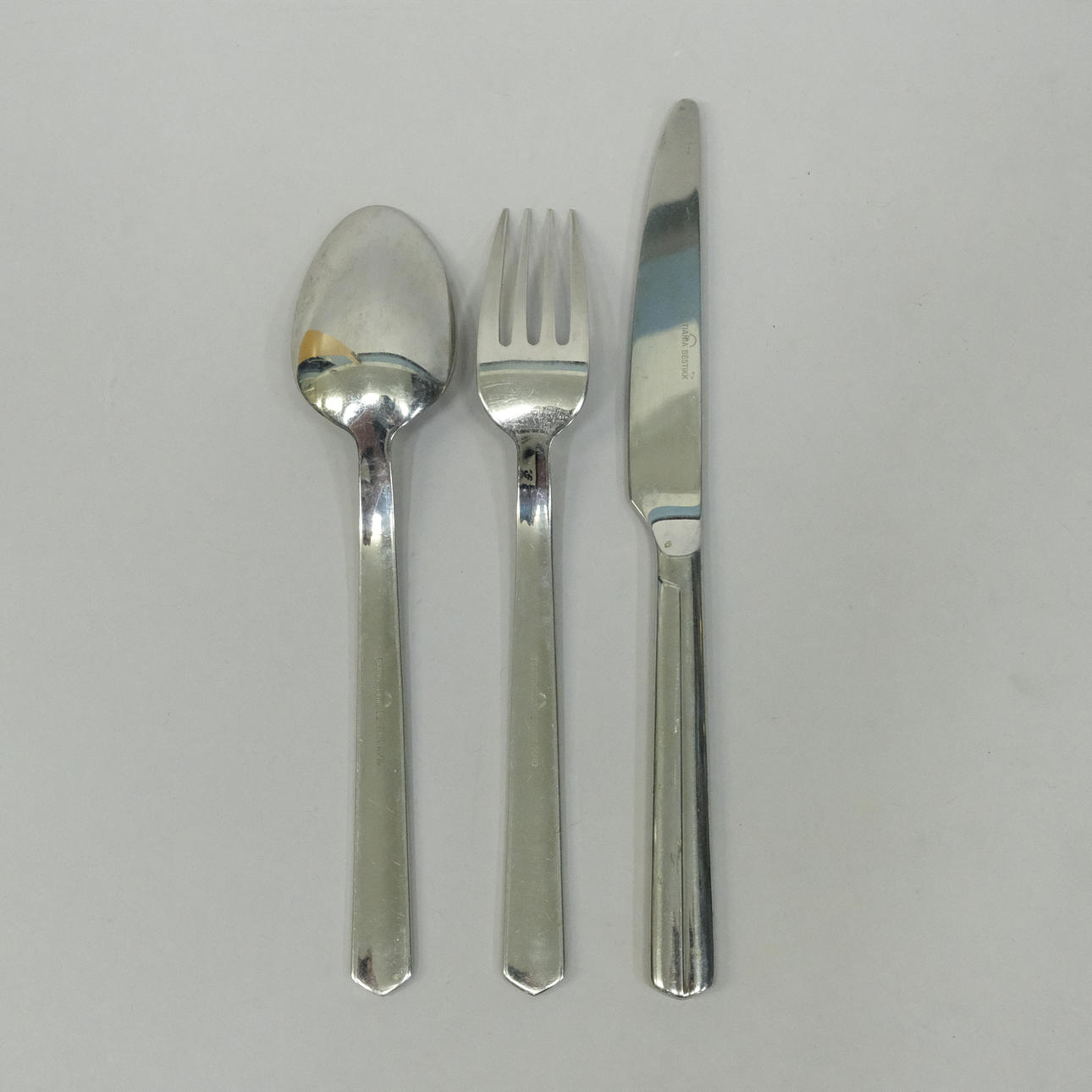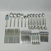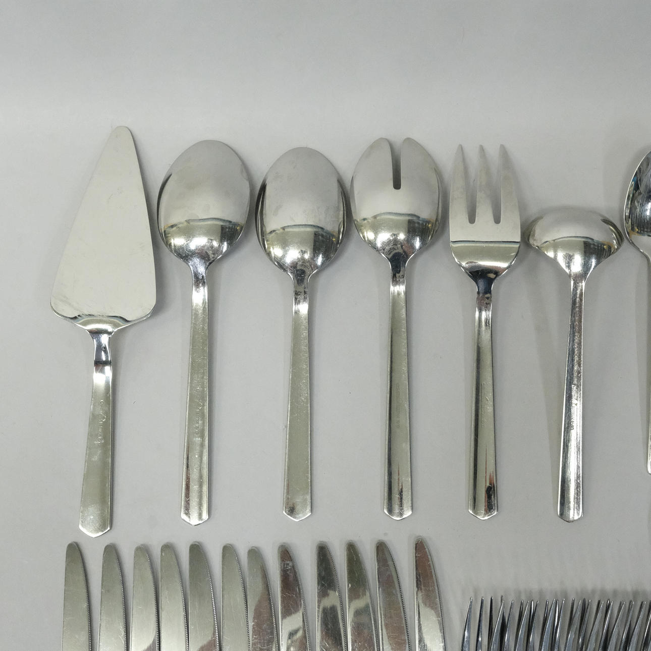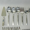 12 knive, længde 22,5cm, 11 gafler, længde 20cm, 12 skeer, længde20cm, 11 gafler, længde 15,5cm, 8 skeer, længde 13cm, kageskovl, længde 25cm, øse, længde 18,5cm, to serveringsskeer, længde 22,5 og 23,5cm og salatbestik, længde 23cm.