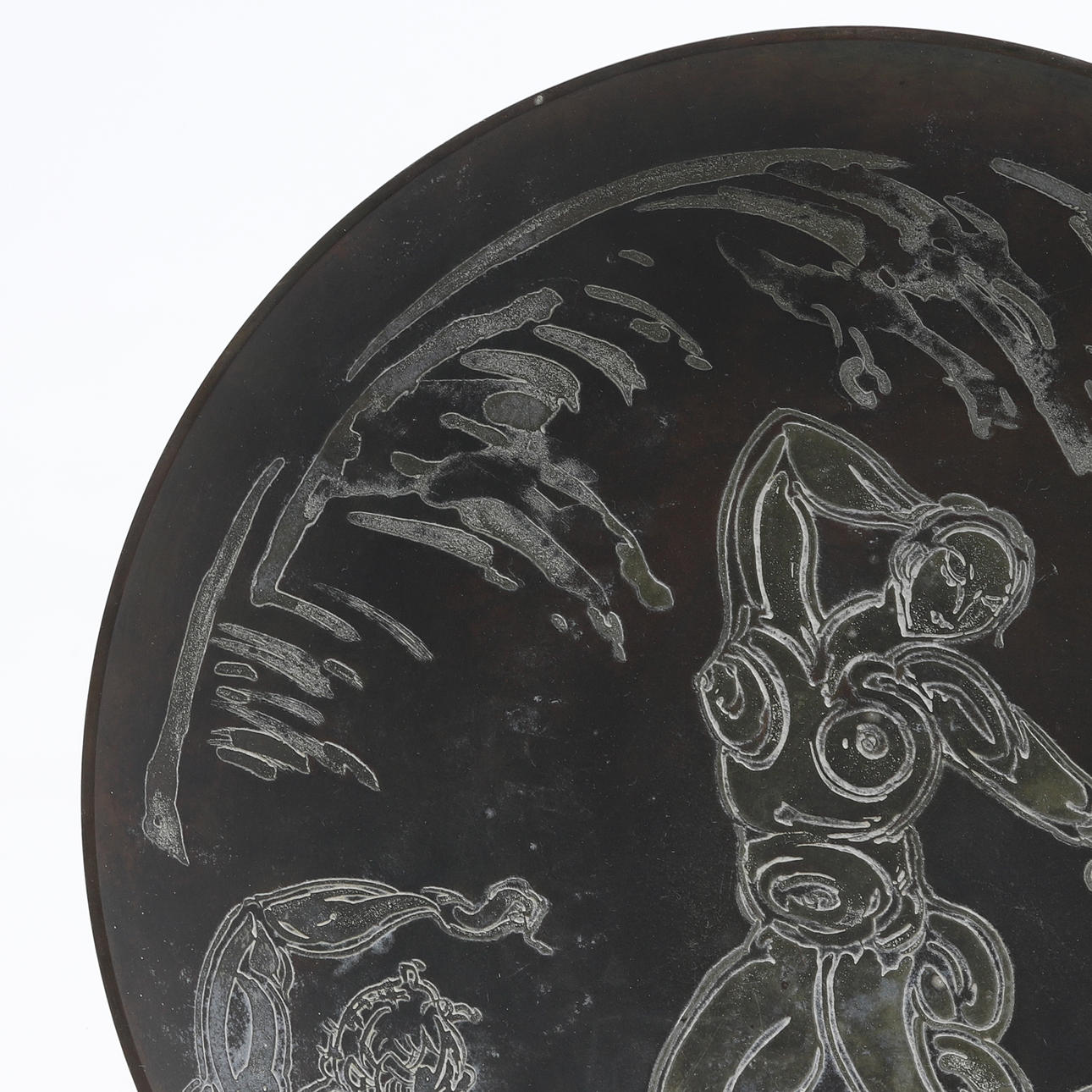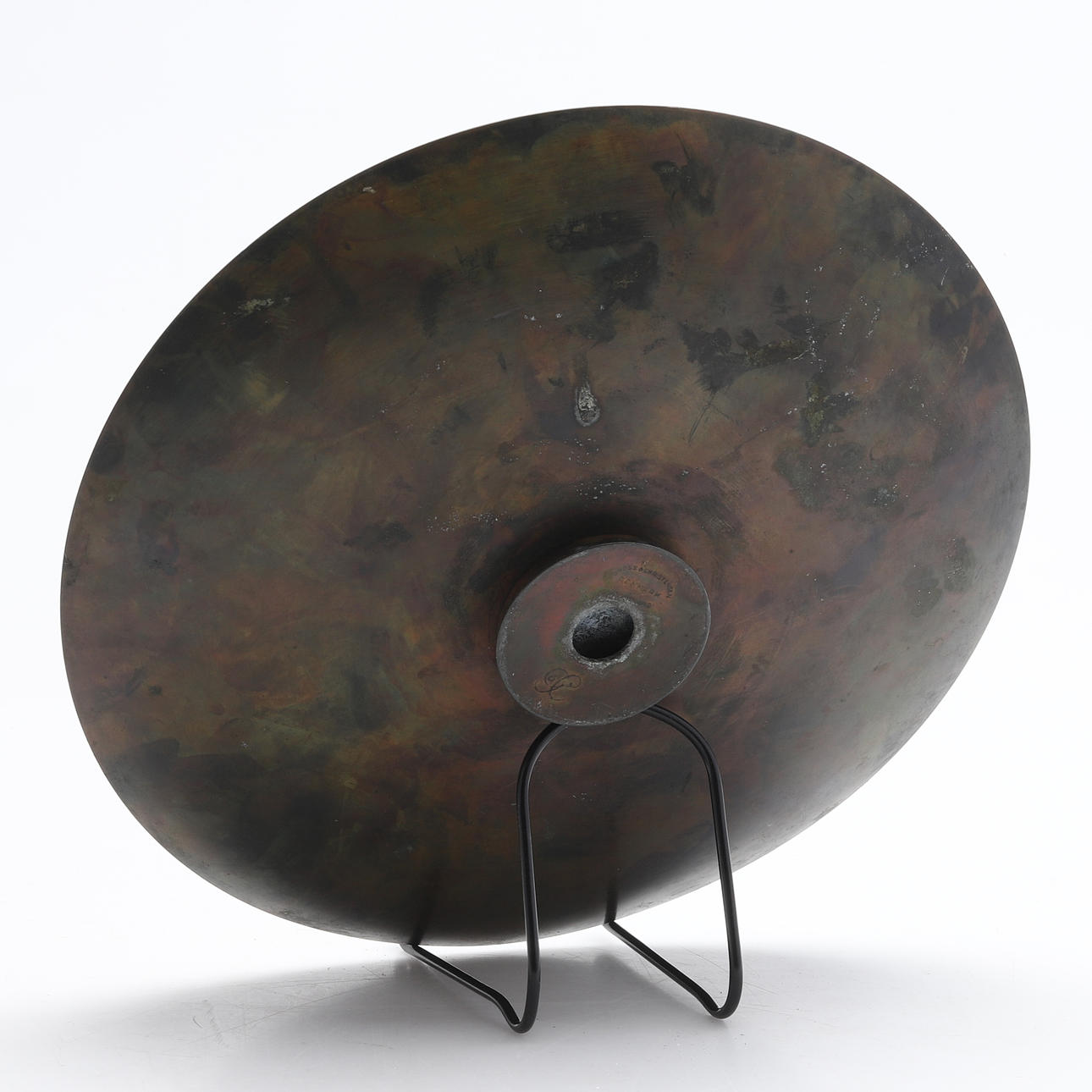 Bronze. Indretning. Har bemærket. Diameter 28,5, højde 4,5 cm.