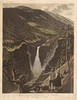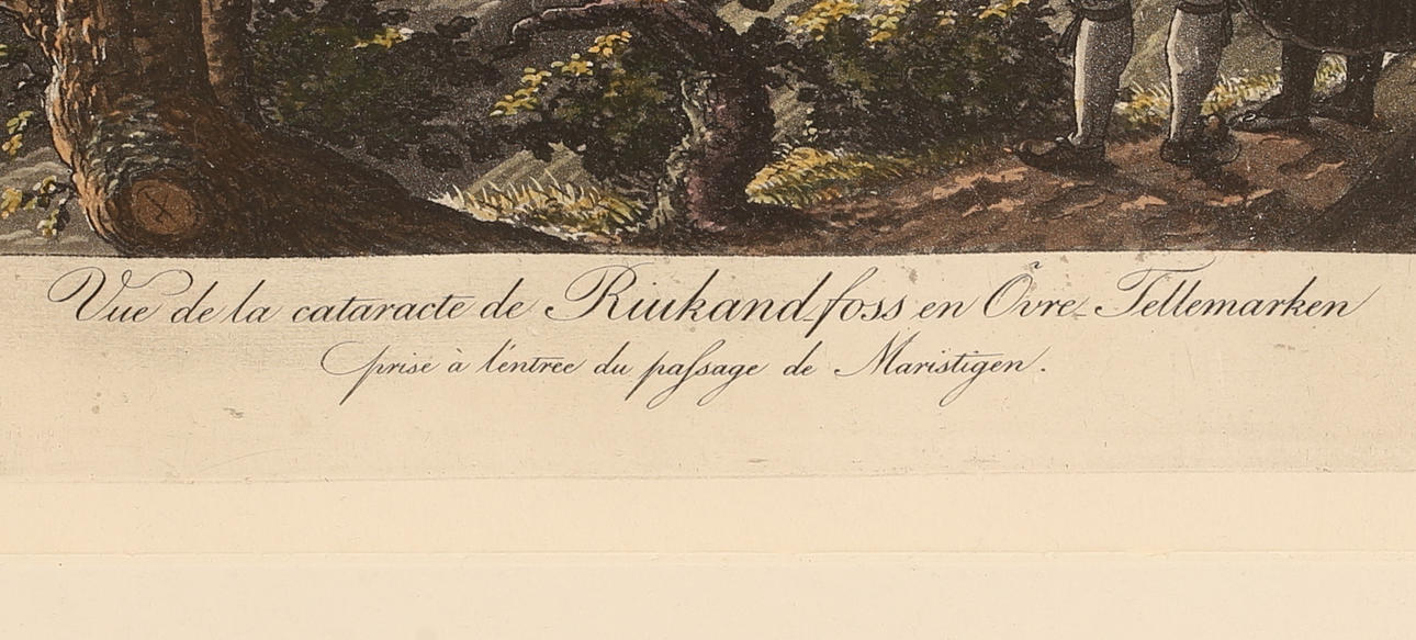 Motiv fra Rukandfoss, øvre Telemarken, håndfarvet, billedmål ca. 43 x 34 cm, karmmål ca. 76 x 64 cm.